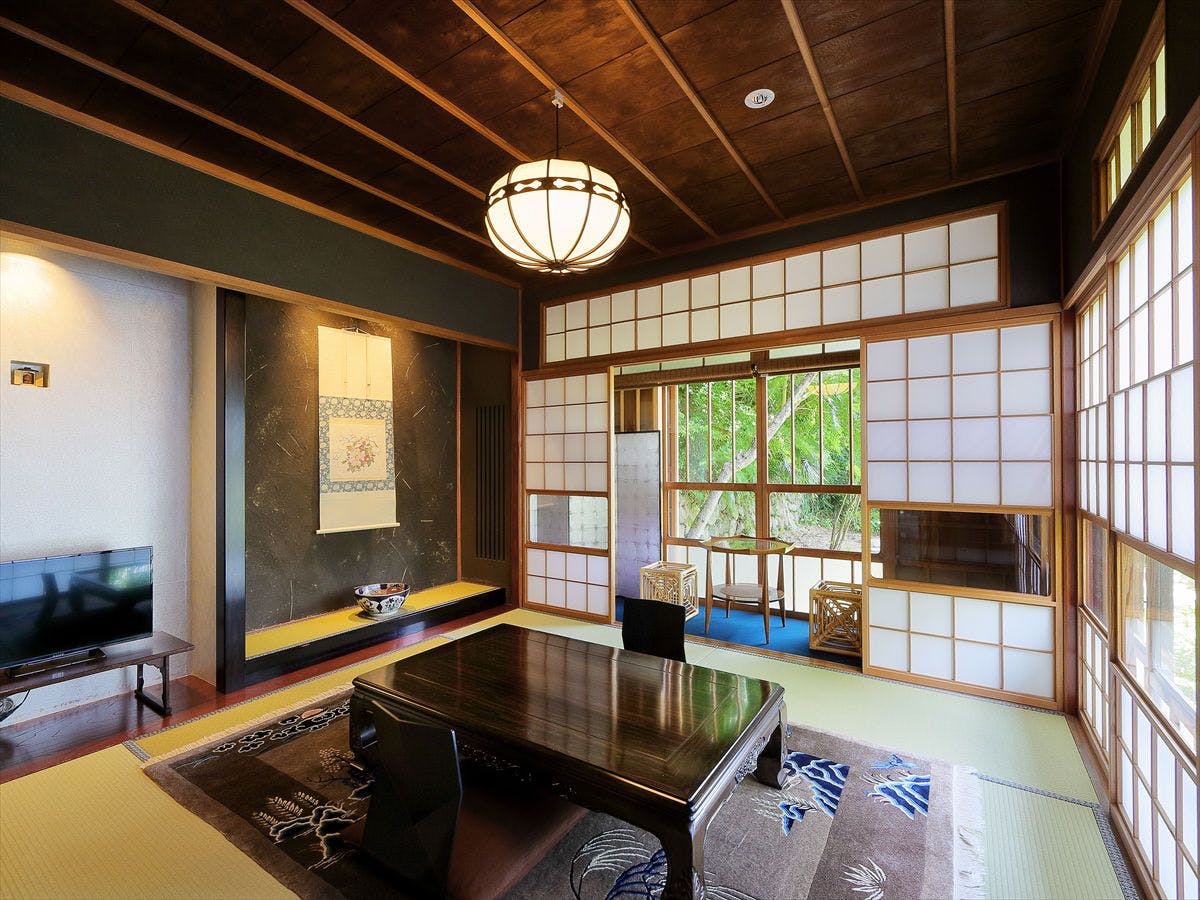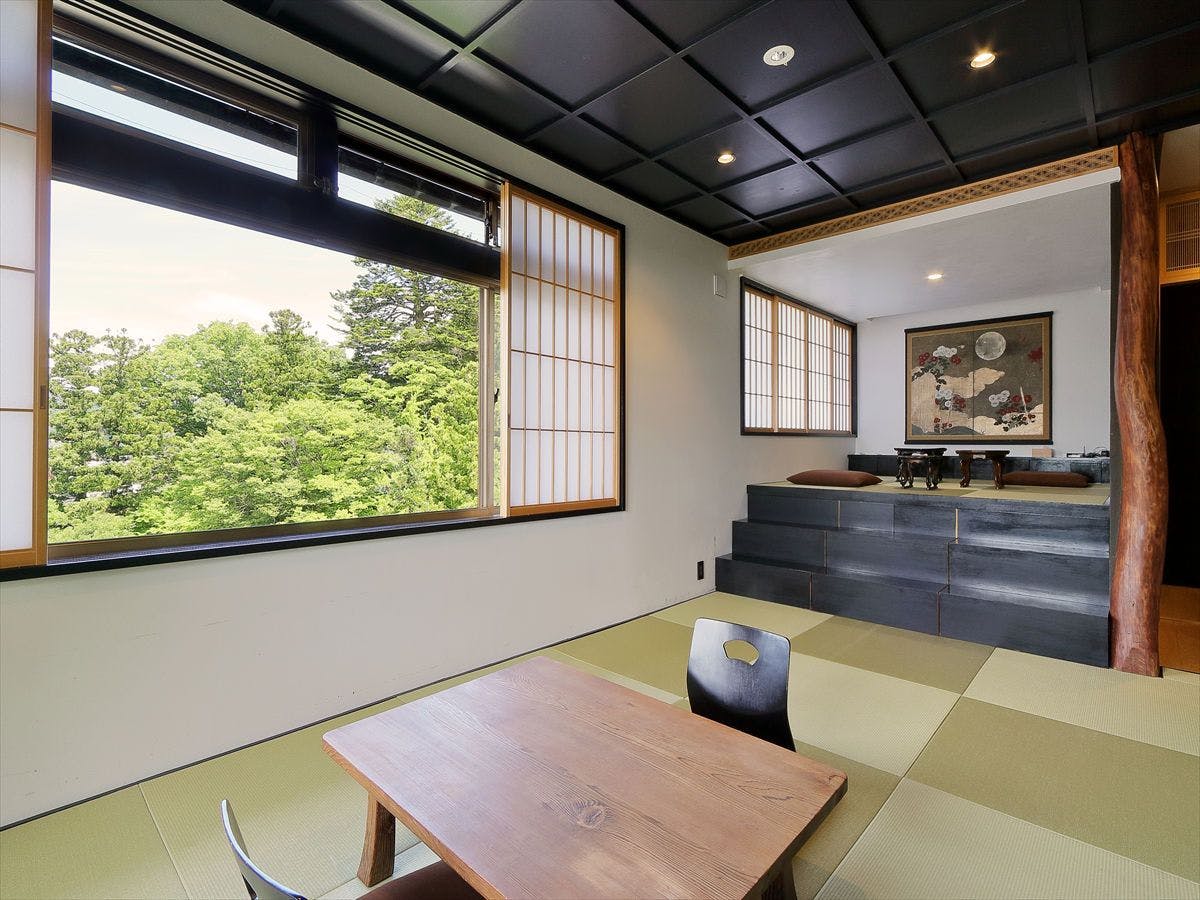 二方向の眺望が素晴らしく、段差のある菊屏風の書斎間が落ち着きます。