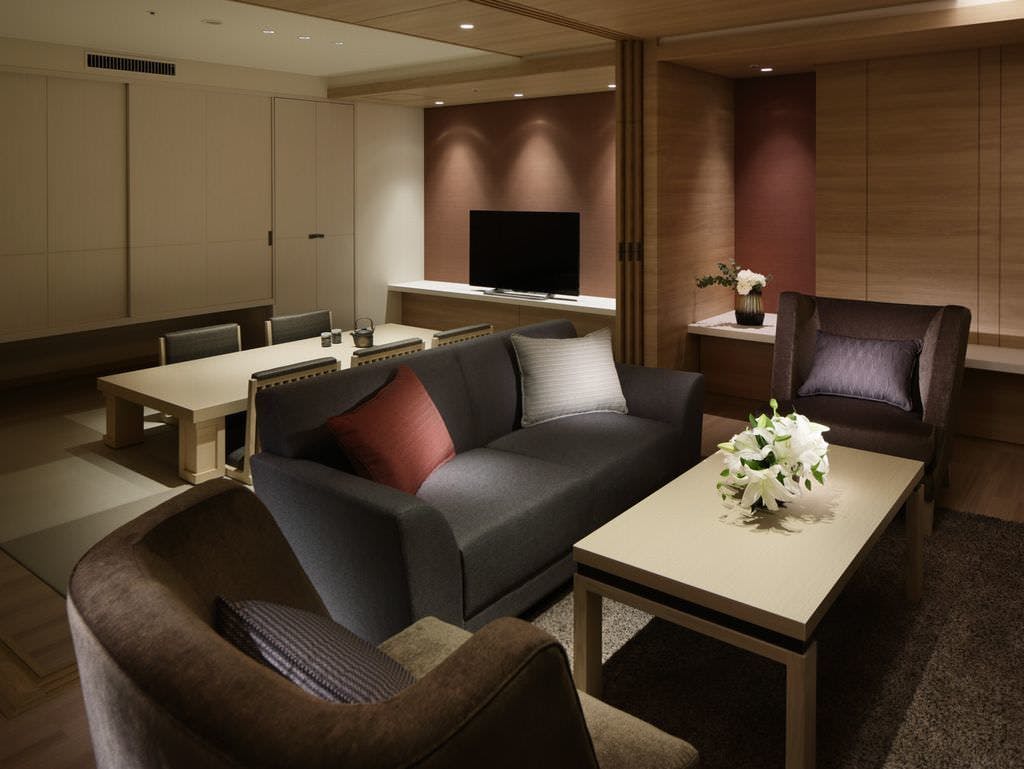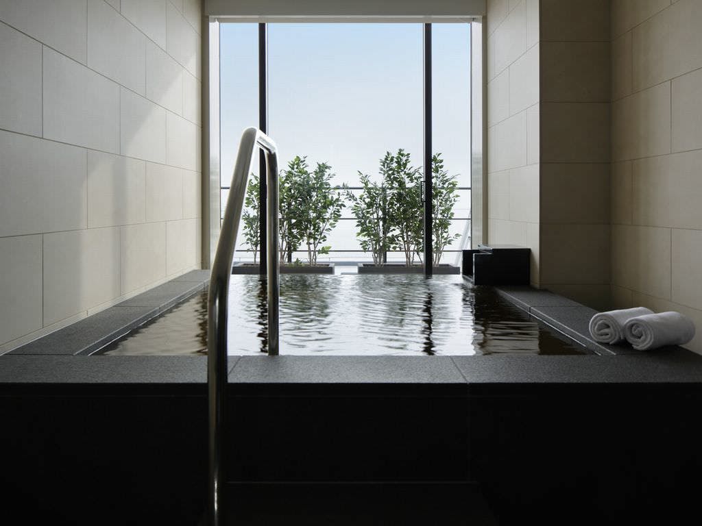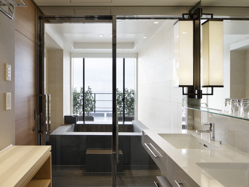 ハーバースイートは4階~8階・南端に位置しており、目の前には空と海のパノラマが広がります。プライベートにゆっくりと温泉をお愉しみいただけるよう、客室には源泉かけ流し半露天温泉をご用意。洗い場のシャワーには話題のシャワーヘッド「ミラブルプラス」を導入しております。スイートにご宿泊のお客様は岩盤浴・溶岩浴/フィットネスジム/屋内外プールを滞在中、追加料金なしでご利用いただけます。ワンランク上の特別室で、ゆったりとしたお寛ぎの時をお過ごしください。