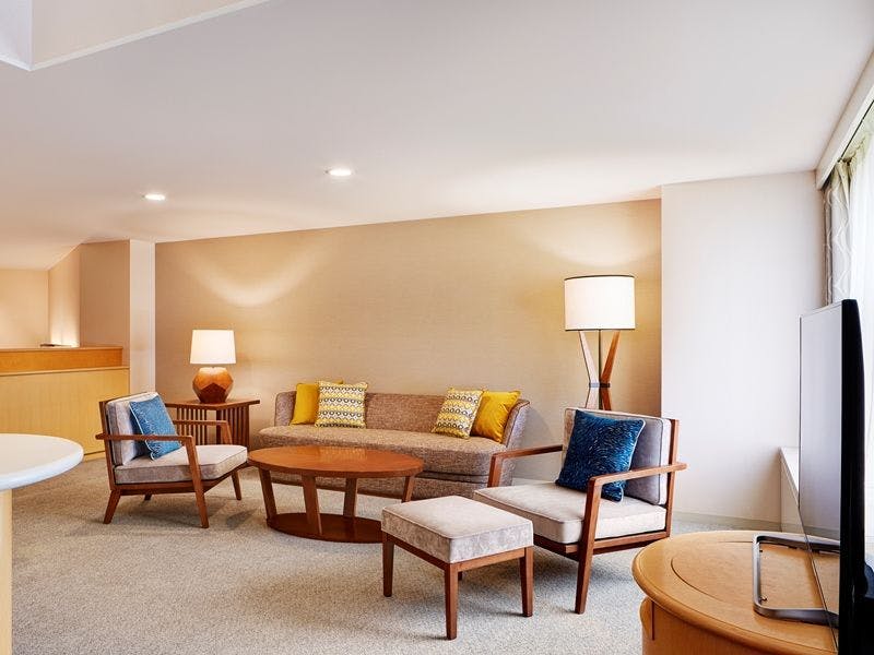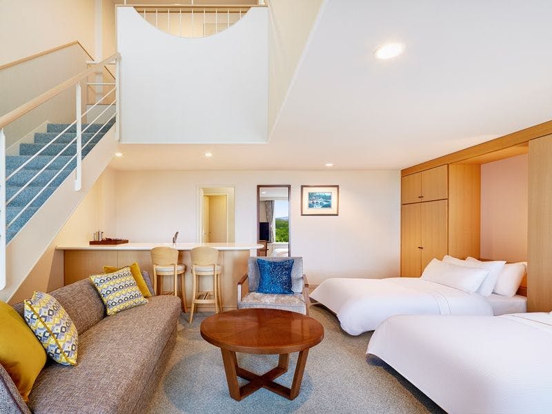 客室はすべてメゾネットタイプの76平米以上、高い天井と素晴らしい眺めを囲む大型の窓でゆとりある空間でお寛ぎいただけます。
