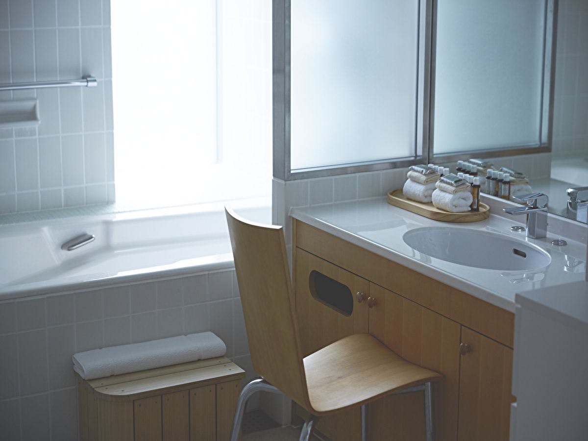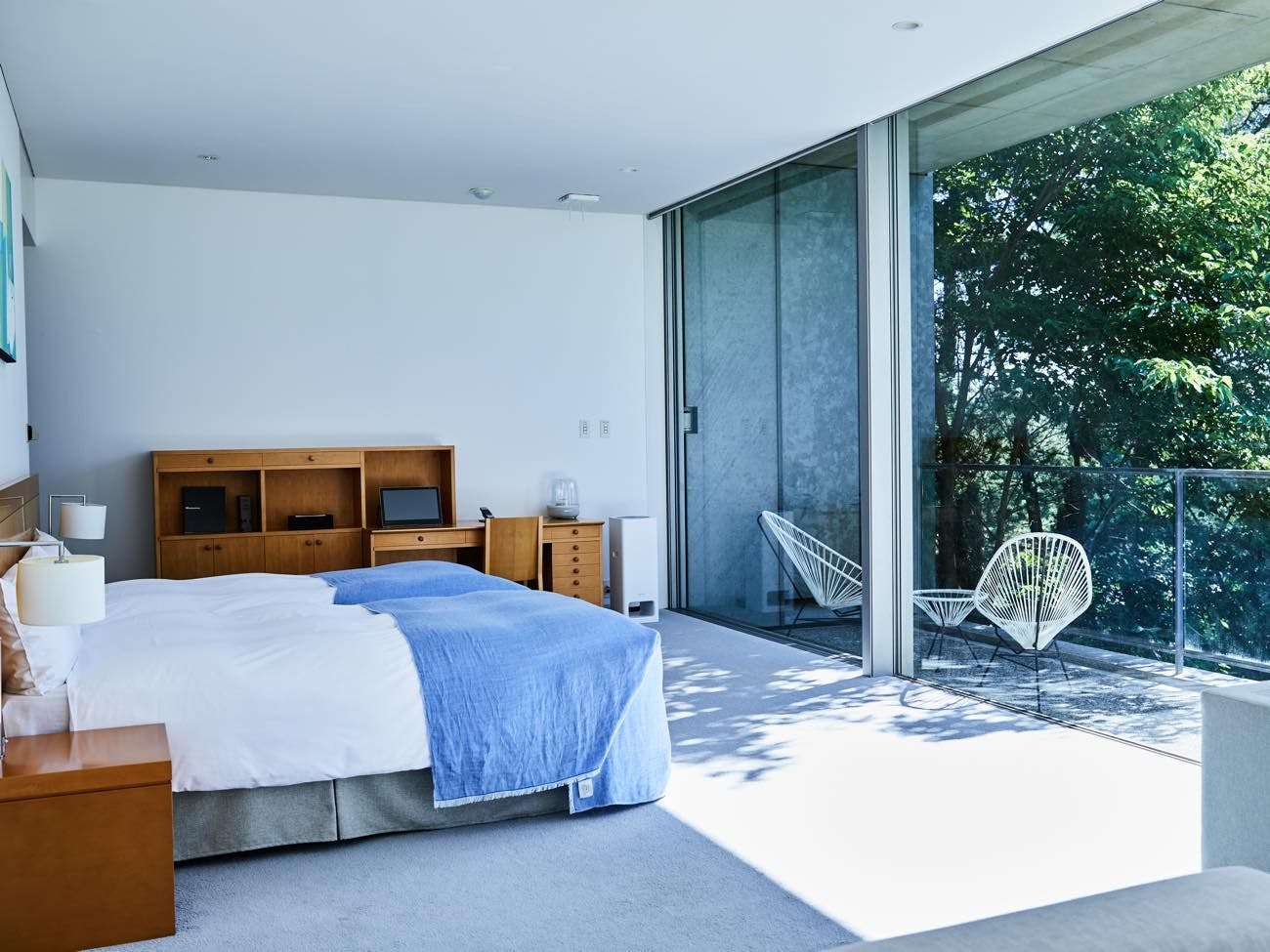 2フロアメゾネットタイプで、下階にはテーブルやソファのあるリビングルーム、上階にはベッドルーム、ジャグジータイプのバスルームをご用意。書斎も備えた169.6平米のゆったりとした空間がお客様をお迎えします。刻一刻と表情を変える海と空。浮かぶ島々が幻想的な瀬戸内海の大パノラマが見渡せます。天井から床までガラス張りの窓と、シモンズ社の上質なリネンをまとった極上の寝心地を味わっていただけるベッドを。快適なご滞在のための設備やアメニティも充実しています。