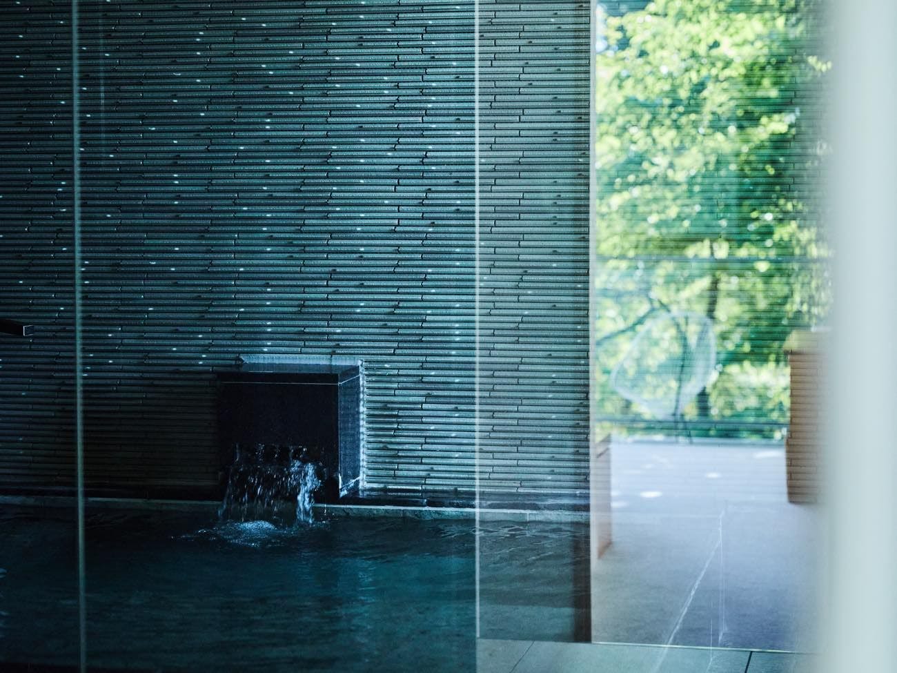 オリジナルのフルフラット寝湯を備えた半露天温泉スイートです。