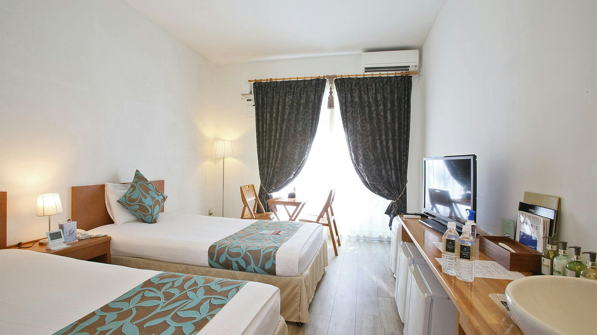 21平米 ベランダ付き ベッド幅110cm×2台小学生未満添い寝無料/朝食別料金海まで徒歩3分※バスタブはございません。シャーワーブースのみとなります。