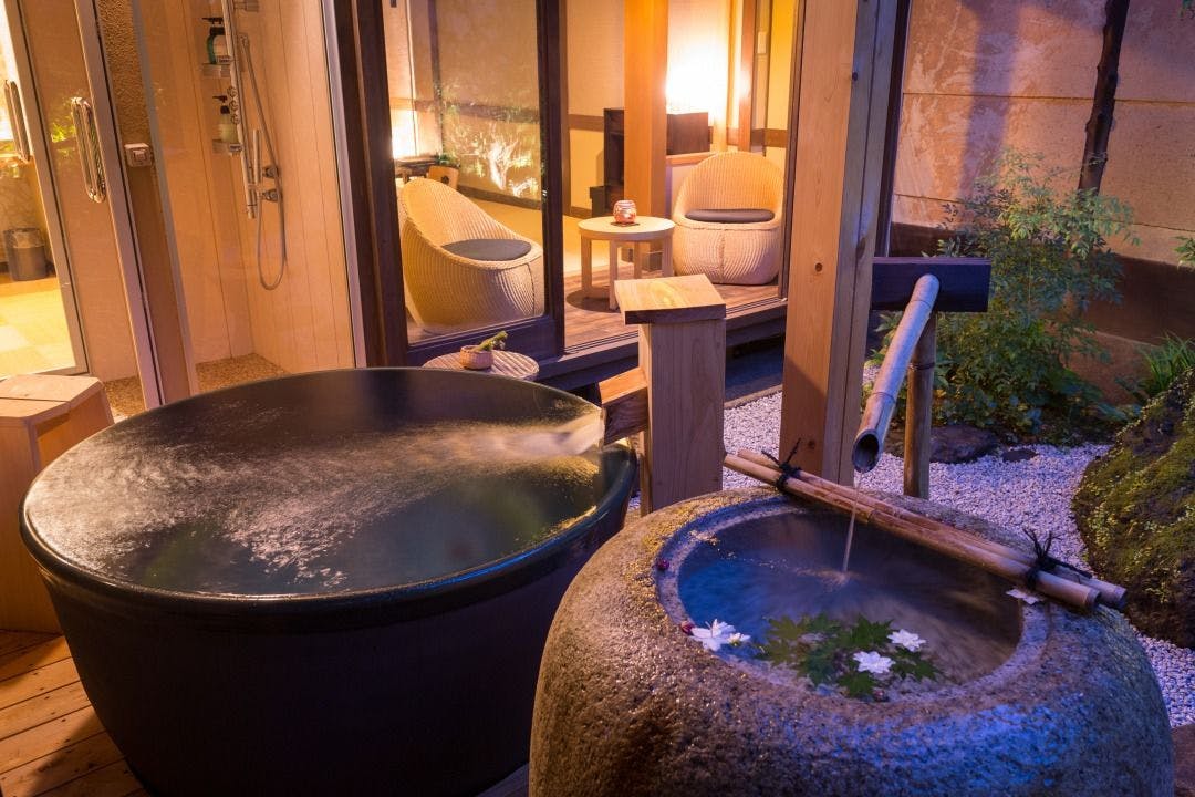 和の雰囲気を残しつつ、洋のイメージを融合させたスタイリッシュなお部屋。京都の伝統的な町家造りに現代のスタイルを取り入れたお部屋。60平米の広々としたお部屋には、信楽焼の露天風呂も備わり、心おきなくプライベートな湯浴みをご堪能いただけます。