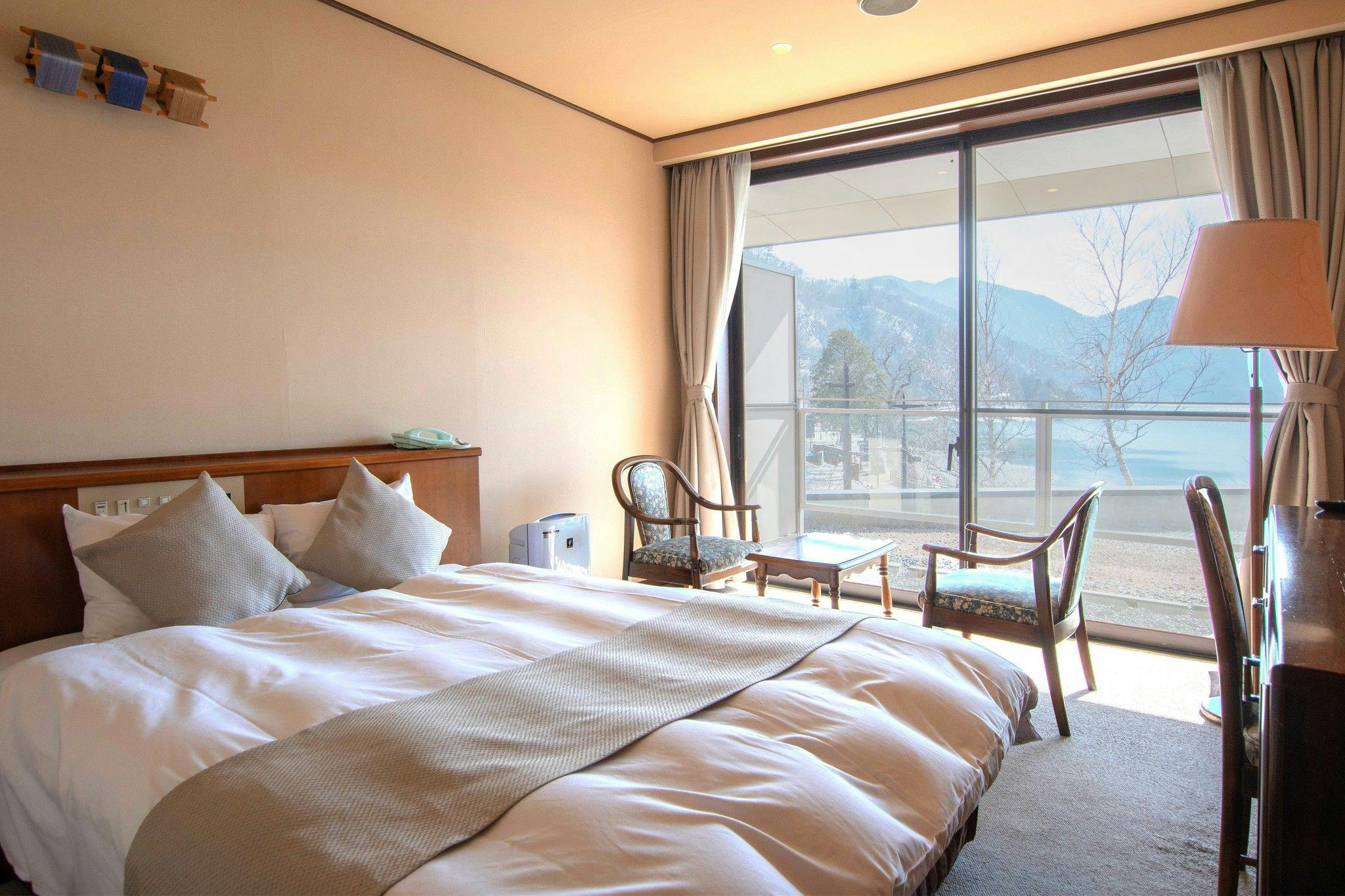 2階のフロアーに配されたダブルルームは、壁一面の窓から中禅寺湖を間近に眺めることができます。