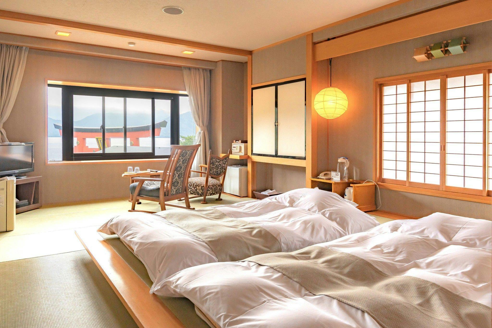 入口から窓辺に向かって「和室」「畳間のベッドスペース」「掘りごたつ」を備えた和室が続く開放的な客室です。寝具にはマットレスパッド「エアウィーヴ」を導入。適度な反発力とすぐれた耐圧分散性が上質の眠りを促します。