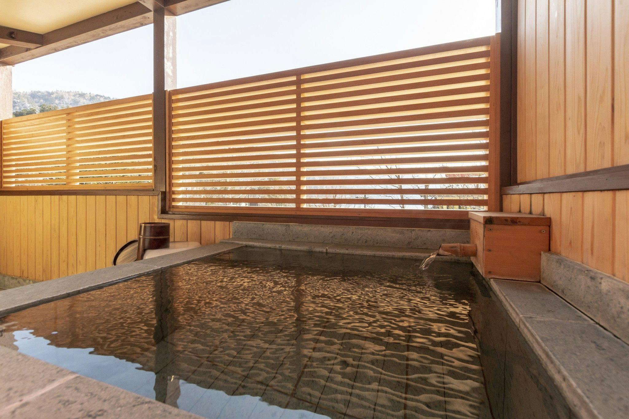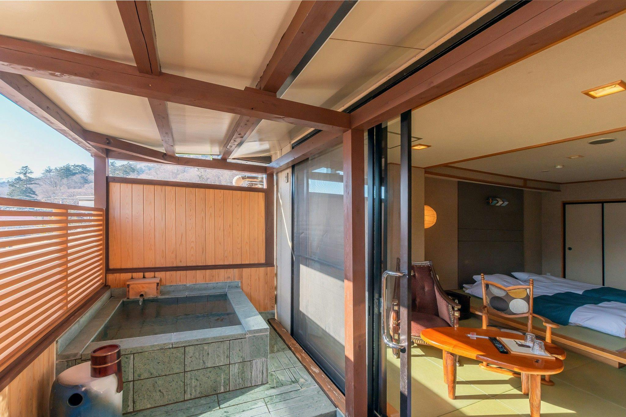 琉球畳が足裏に柔らかな感触を伝える居心地の良い和モダンルーム。ベランダ部分に美肌の湯といわれる日光・和の代温泉のアルカリ単純泉の専用露天風呂があり24時間お好きな時にご入浴いただけます。寝具にはマットレスパッド「エアウィーヴ」を導入。適度な反発力とすぐれた耐圧分散性が上質の眠りを促します。
