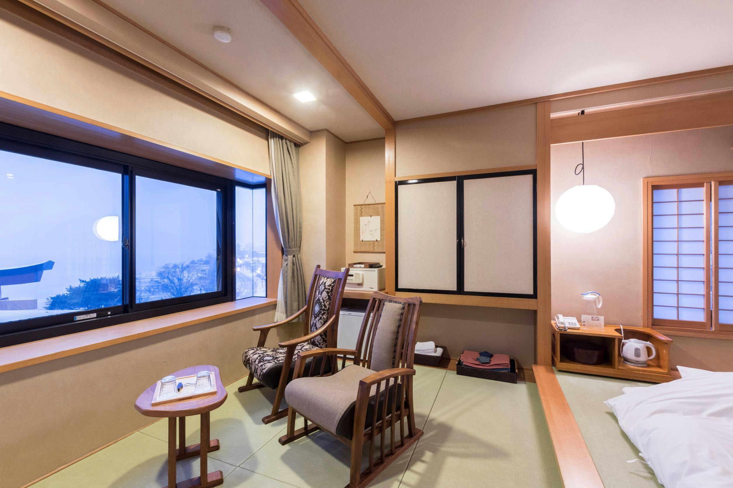 窓側に設けられた寛ぎのスペース「月見台」からは、一面に広がる中禅寺湖の美しい景観をご覧いただけます。