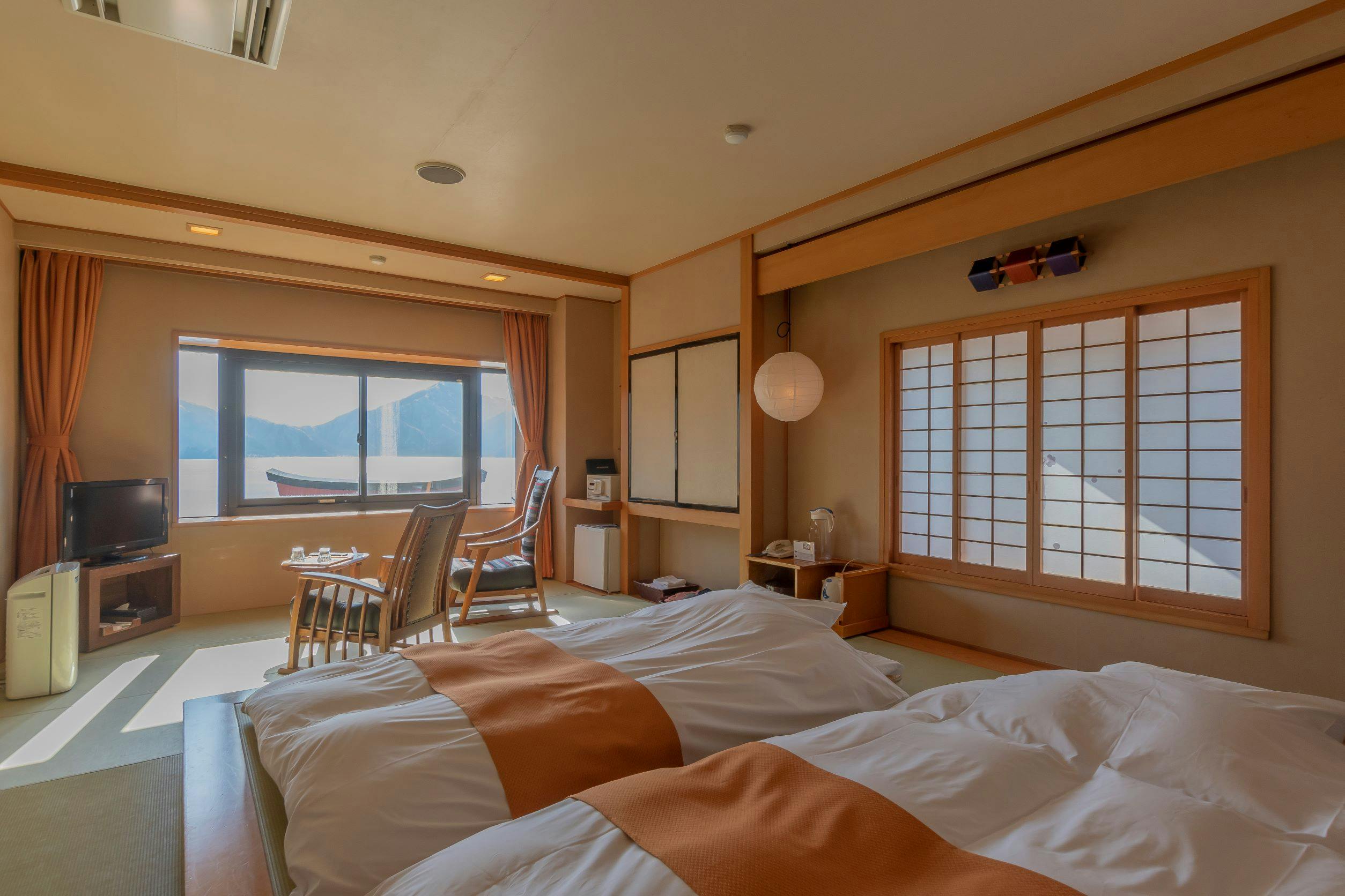 2階のフロアーに配されたスタンダードツインルームは、壁一面の窓から中禅寺湖を間近に眺めることができます。