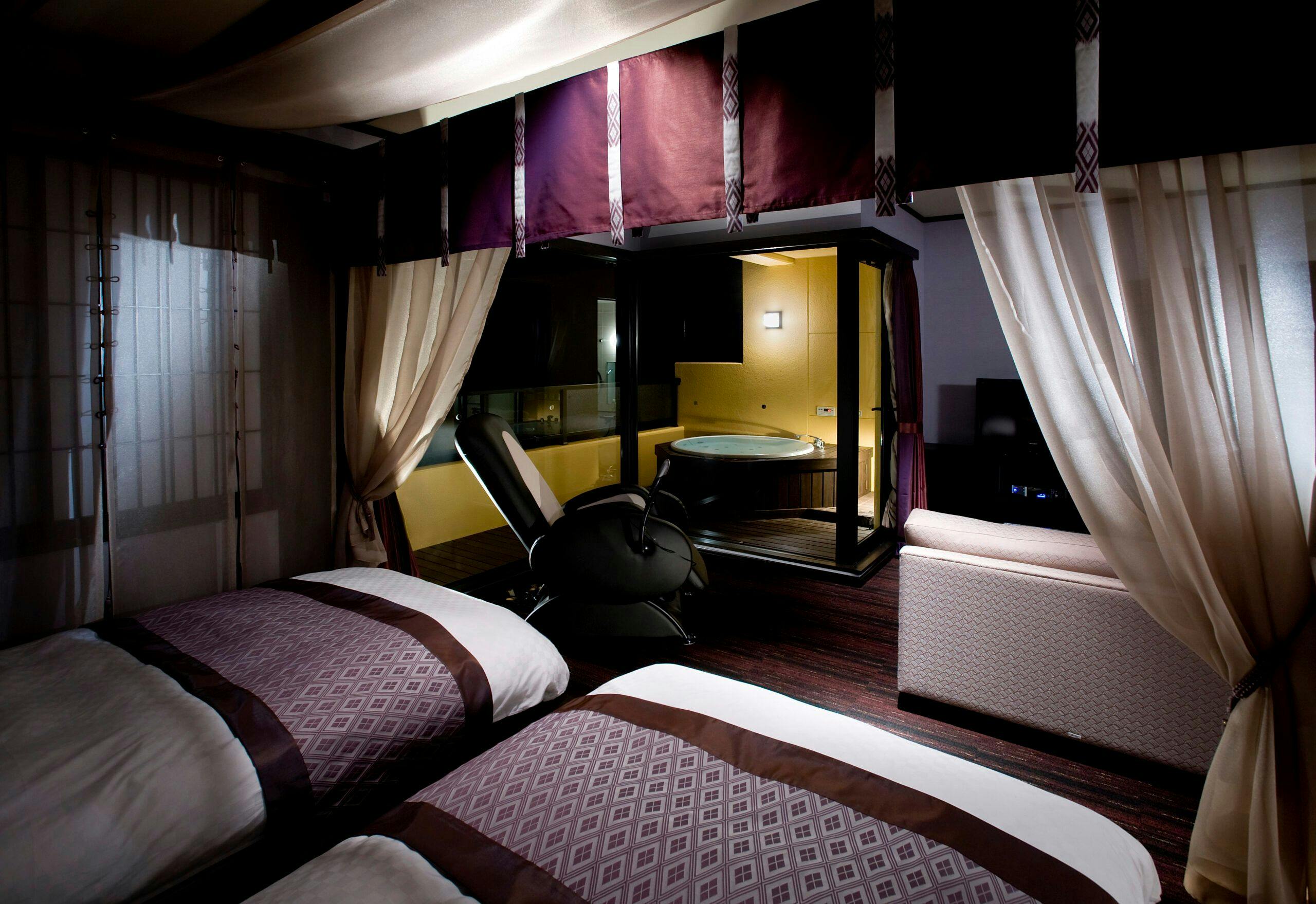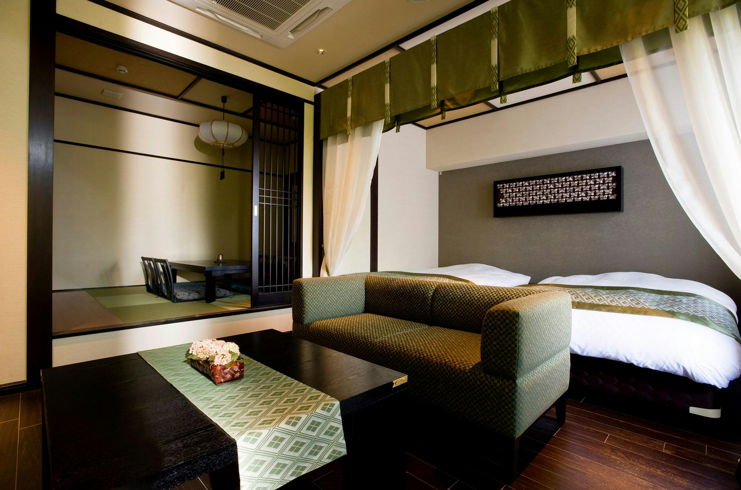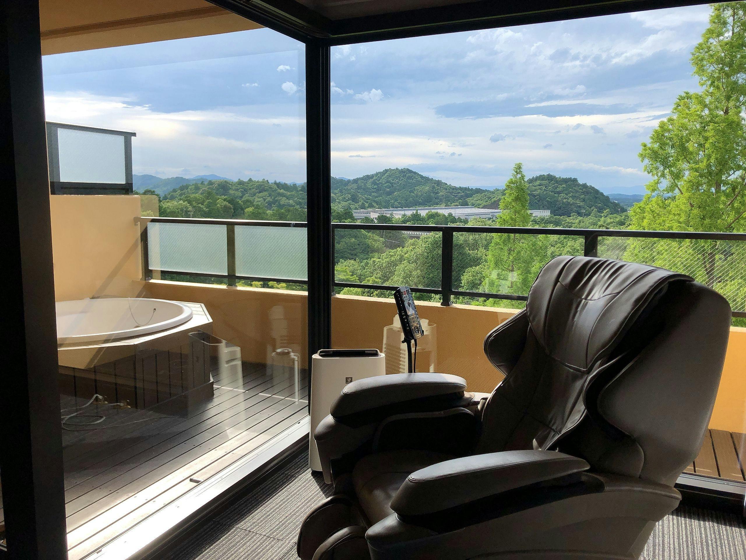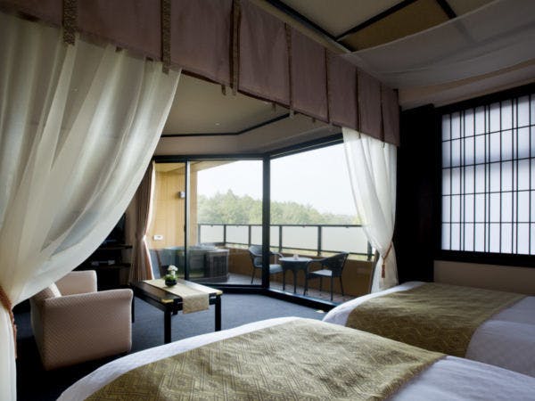 天蓋付きベッドルームと和室を備え、斎王の時代をモダンに再現した空間はまさに王朝世界です。露天風呂も完備しておりますので、お部屋でゆっくりとおくつろぎください。※テラス含め全室禁煙でございます。※お部屋のお風呂は温泉ではありません。