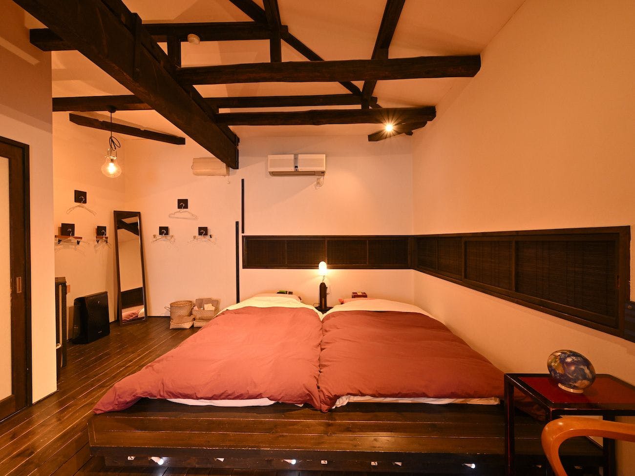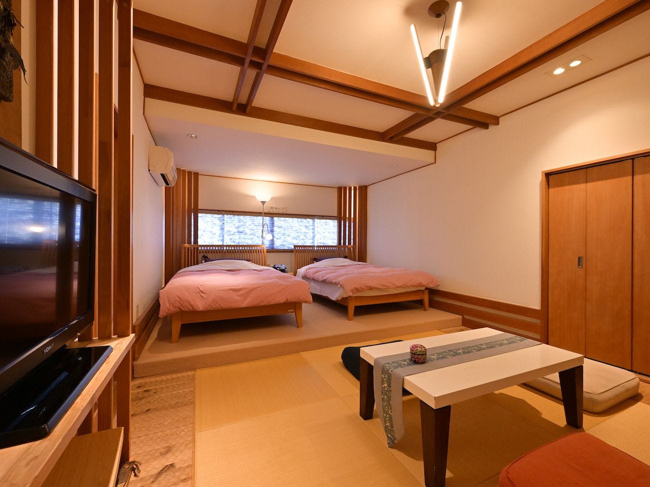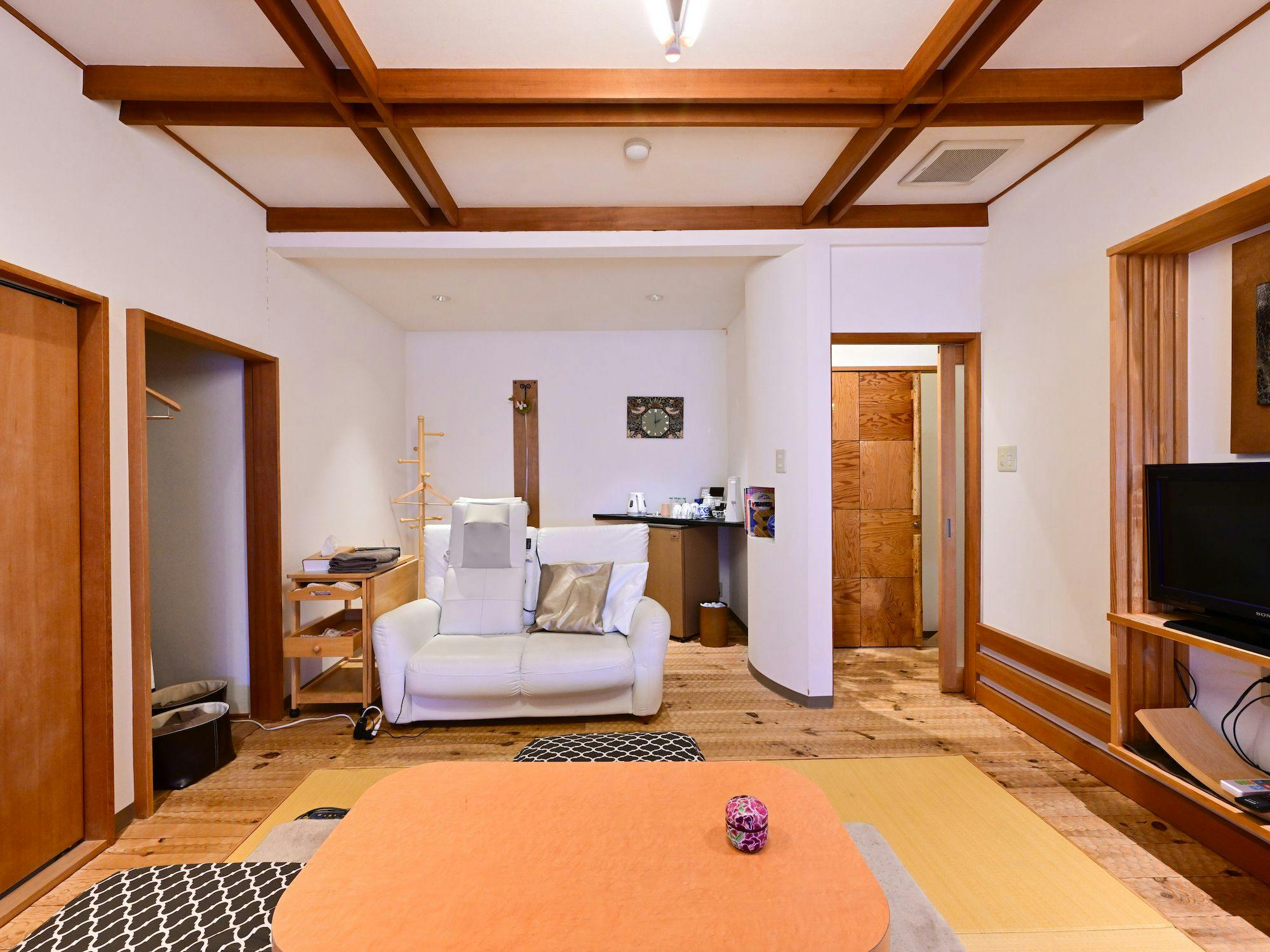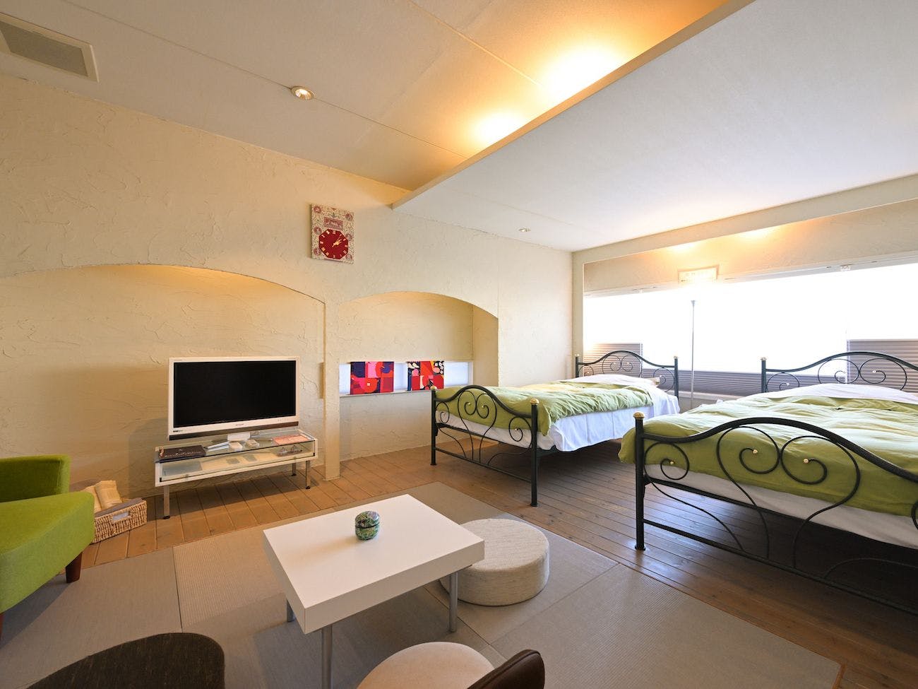 「夕星(ゆうずつ)」は、帰ってきたと肩の力がほっと解けるような、素朴で優しいお部屋。穏やかなあかりと共に心なごみます。お二人仲良くお座りいただける白色ソファーで語らいのお時間など、ゆったりとしたお時間をお過ごしください。(シャワールーム・トイレ付)