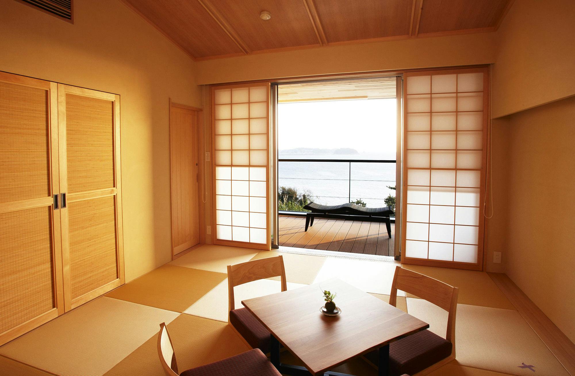 自然素材に包まれた落ちついた内装の客室に杉の板囲いの5畳のテラスとシルキーバスの露天風呂を備えています。目の前に伊勢湾と三河湾が広がり寝ていても伊勢志摩まで見渡すことができる絶景の10畳の和室になります。心地良い潮騒とともに雄大な海の景色をお楽しみください。シルキーバスは美肌効果、疲労回復、血行促進、腰痛や肩こり改善などの効能が期待できます。32型液晶TVとナノイー機能付き加湿器や双眼鏡を設置しています。4名様で利用の場合は部屋の広さとお風呂の使い勝手の関係上2室に分かれるか和洋室のご予約をおすすめします。