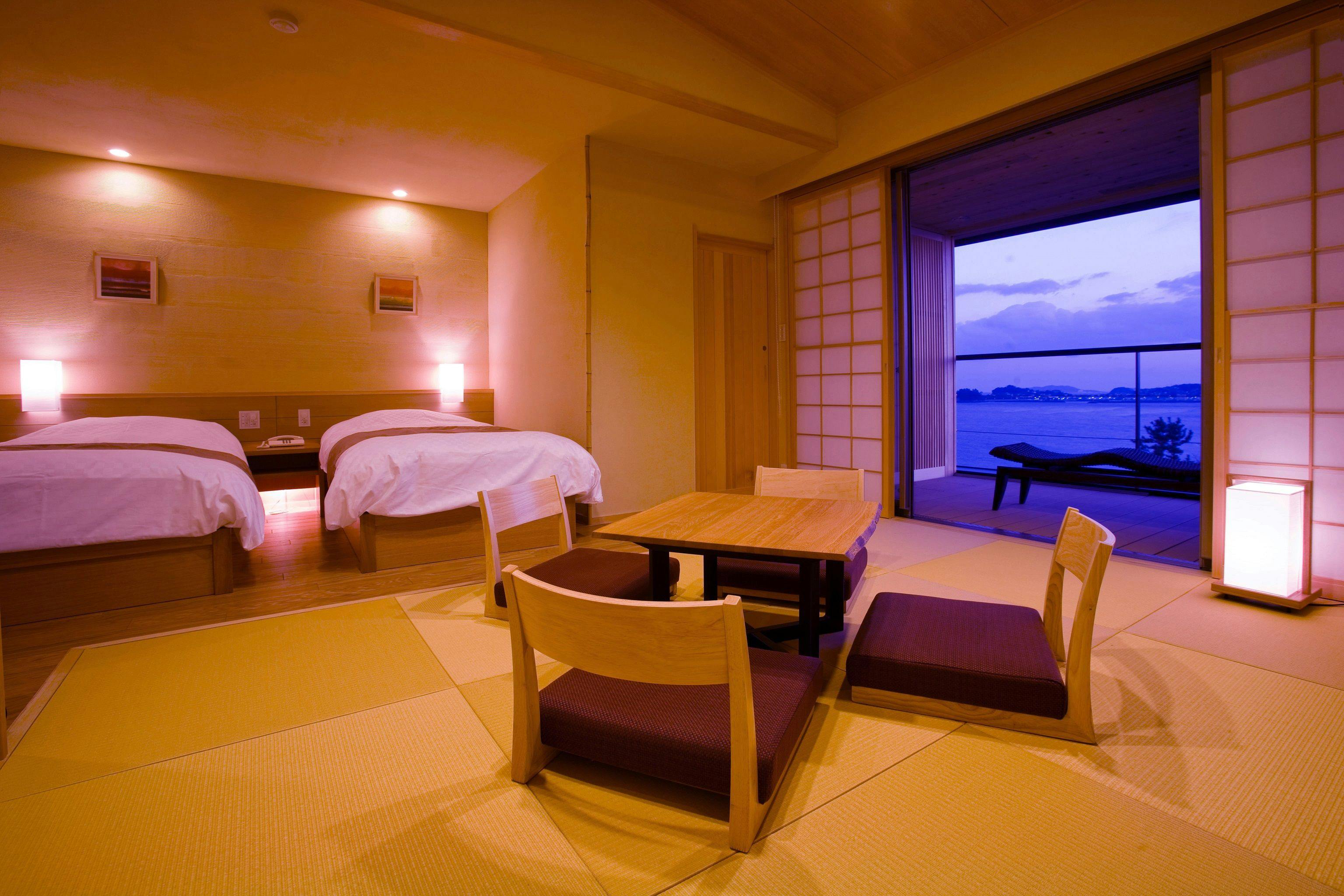 自然素材で包まれた落ち着いた内装の客室に杉の板囲いの5畳のデッキテラスとシルキーバスの露天風呂を備えた悠月の特別室になります。目の前に伊勢湾、三河湾が広がり寝ていても伊勢志摩まで見渡すことができる絶景のお部屋で和室からベッドルーム、テラス、浴室やトイレまですべて段差のないワンフロアータイプの客室になります。心地よい潮騒と夕日、LEDを灯したシルキーバスで寛ぎの時間をお過ごしください。ベッドはシモンズ製で心地よい眠りを誘います。32型液晶テレビとナノイー機能付き加湿器や双眼鏡が設置されています。ブルーレイのソフトはお好みの物を持参してお楽しみください。