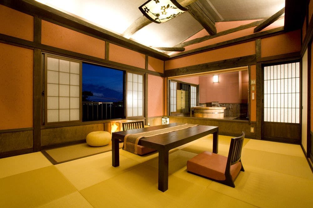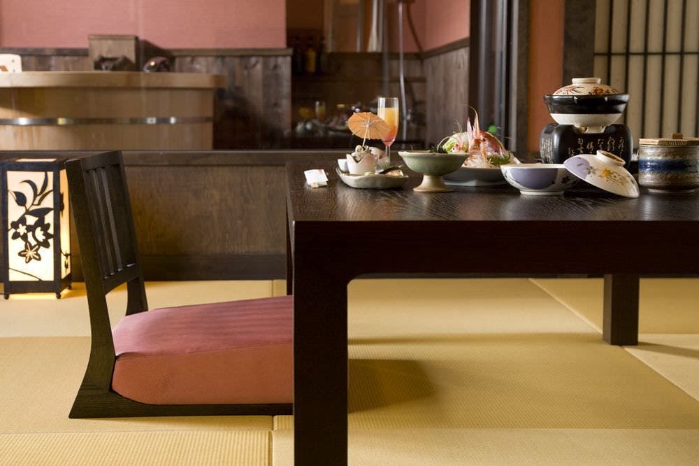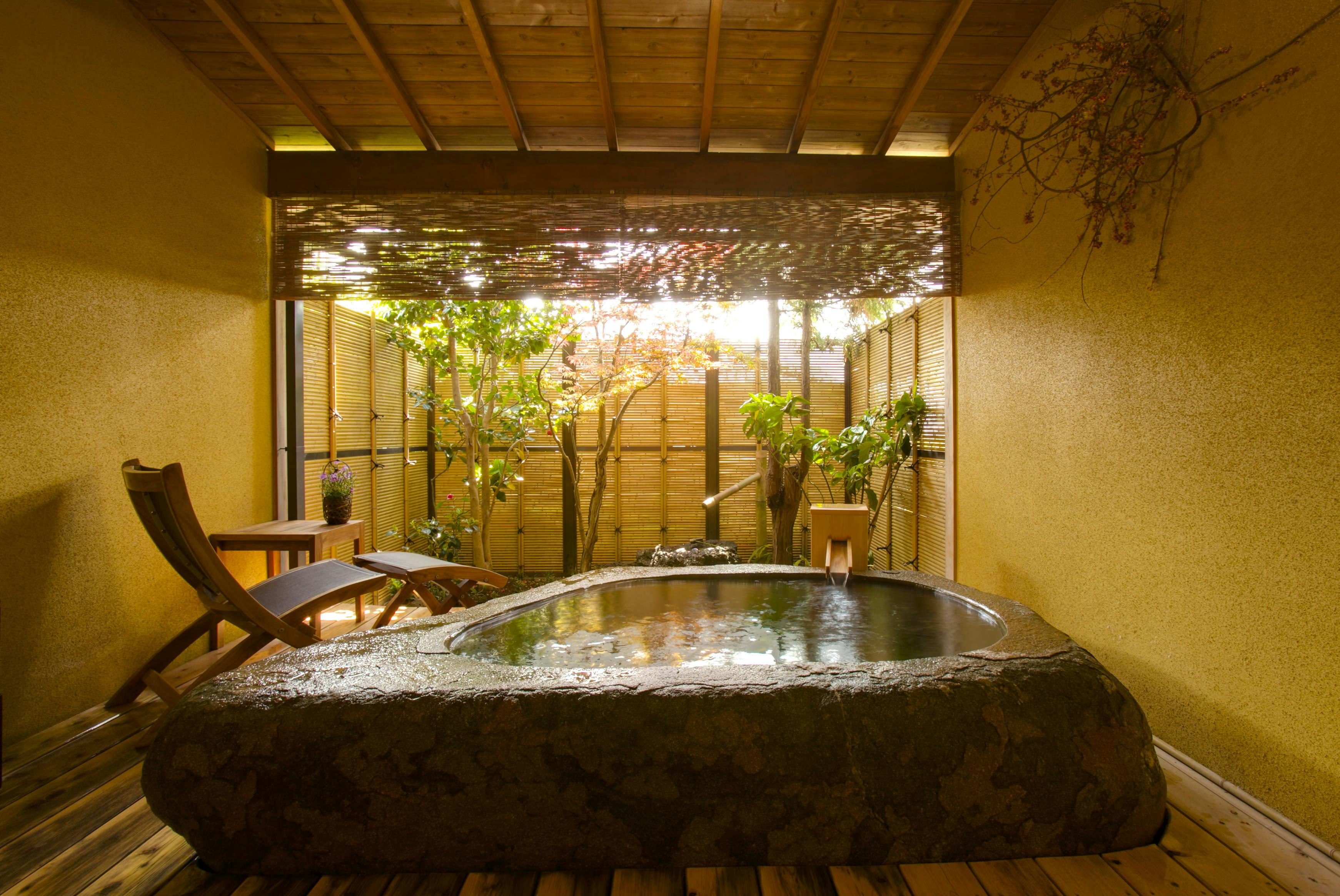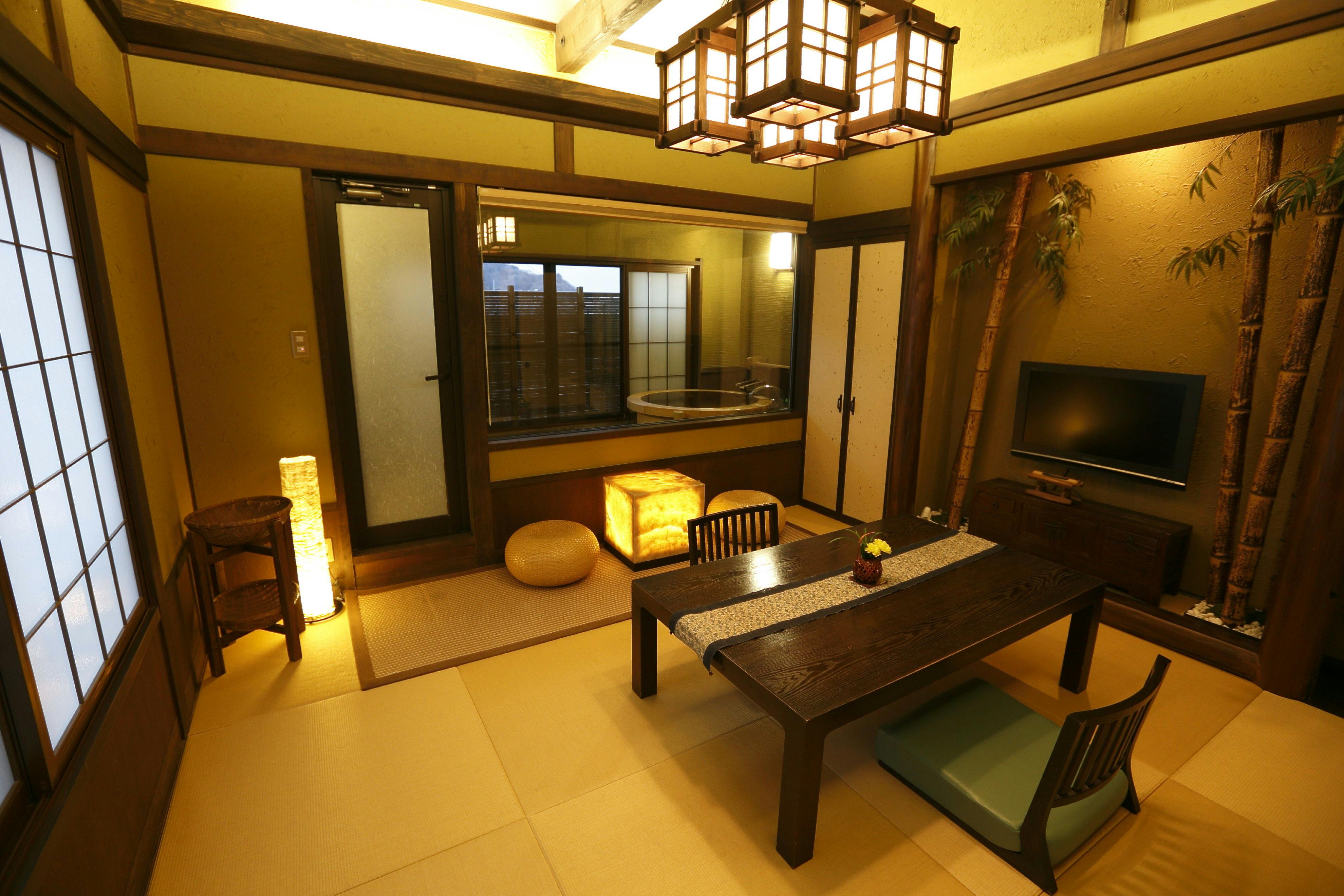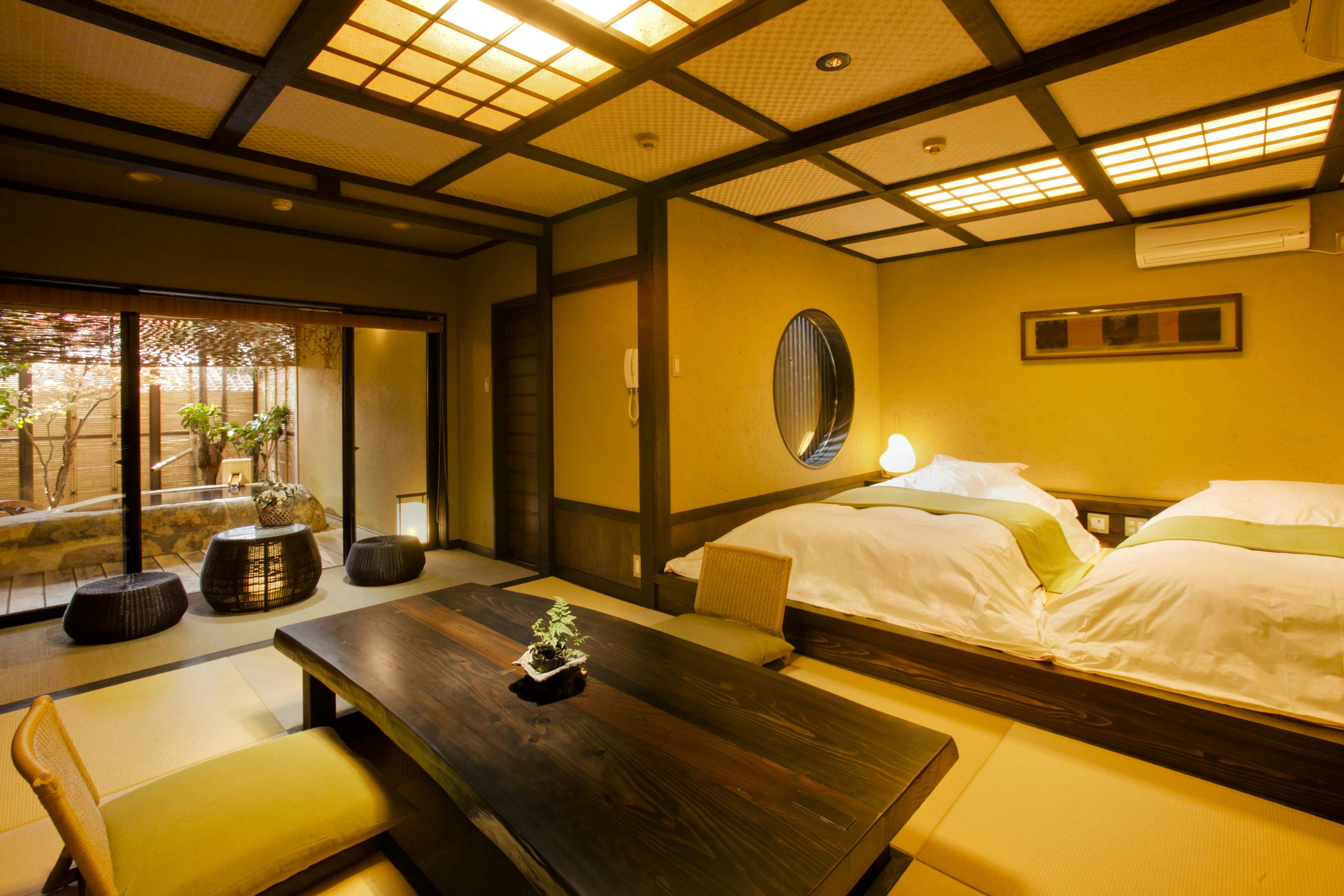 客室専用の露天風呂はございませんが、和ベッドを設えた寝間とお食事を召し上がる和室を簾で仕切り、広さや機能性も十分です。