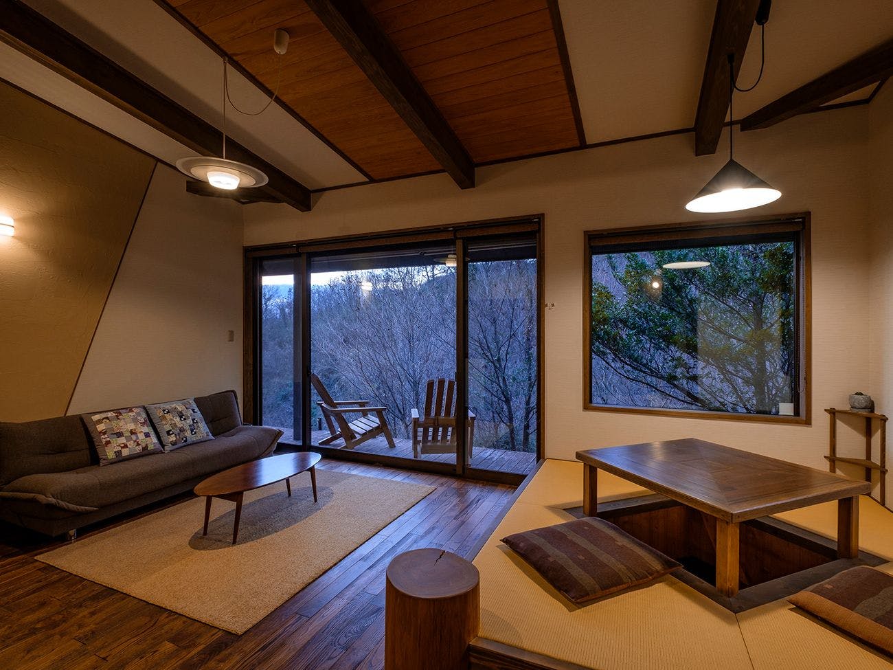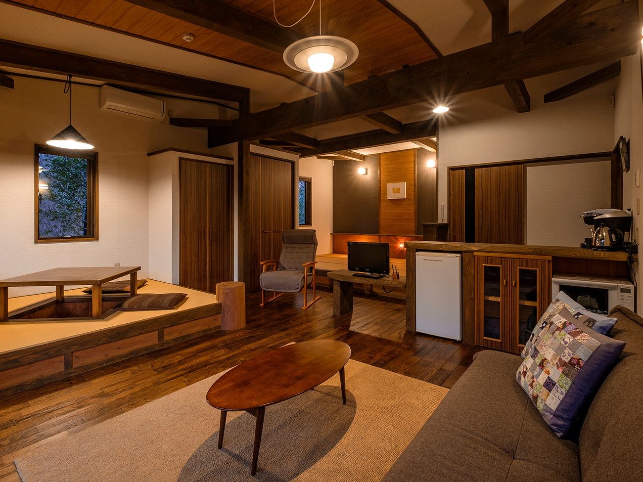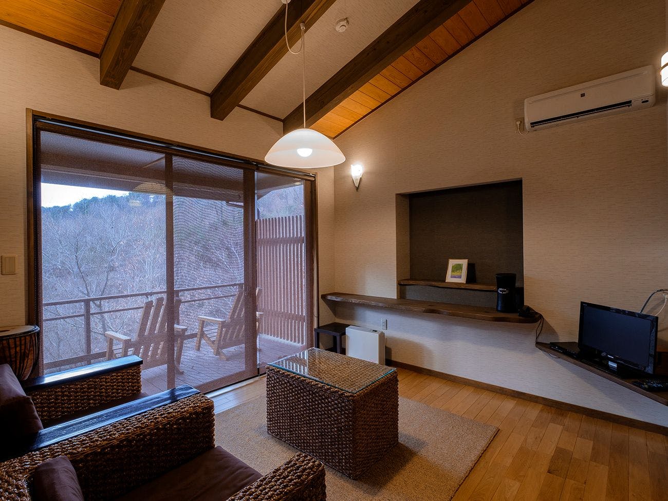 ・リビングは、足をおろして談笑が出来るような作りになっています。・床のフローリングは樺の無垢材を張っています。・寝室は小上がりの和風ベットとなります。・四人様宿泊の場合、お一人様はソファベットとなります事をご了承下さい。・お風呂からも、お部屋からでも、森と小川を眺められます。・お風呂は24時間入浴出来る掛け流しの温泉となります。