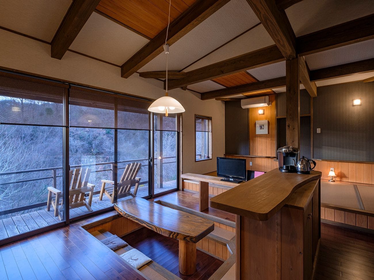 ・お部屋のリビングの一角の床をあげて、掘り炬燵風の作りとなります。・床のフローリングは栗の無垢材を張っています。・寝室は小上がりの和風ベットとなります。・お風呂からも、お部屋からでも、森と小川を眺められます。・お風呂は24時間入浴出来る掛け流しの温泉となります。