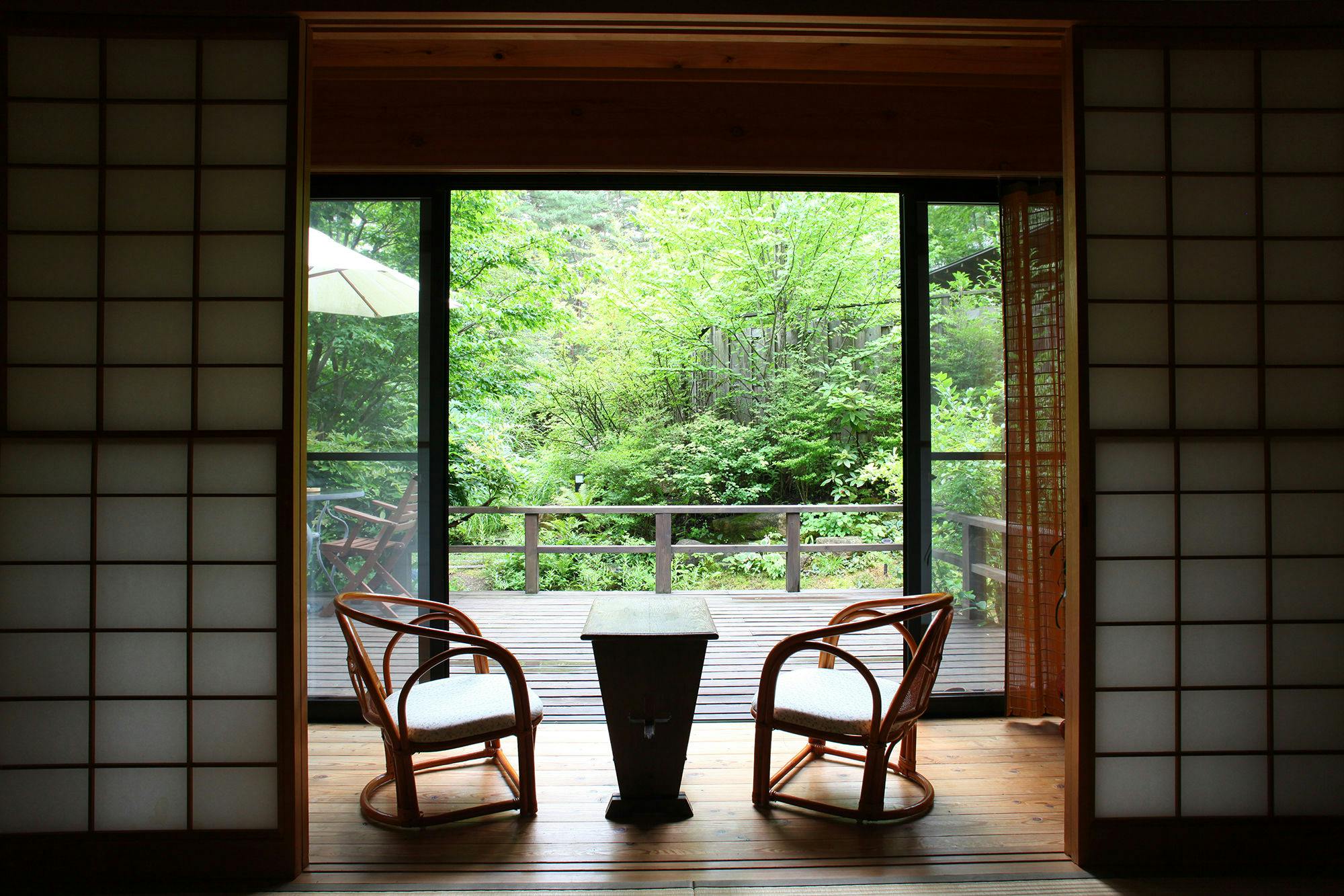 安曇野の里に佇む大人の隠れ家。古民家を移築した母屋は、大切に使い込まれた柱や梁、囲炉裏が温もりある空間を演出。焼きものや絵、骨董品、中庭の山野草などがうまく調和。地元の食材を生かした懐石料理が美味。