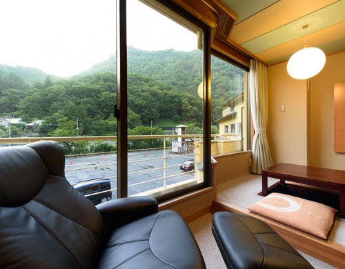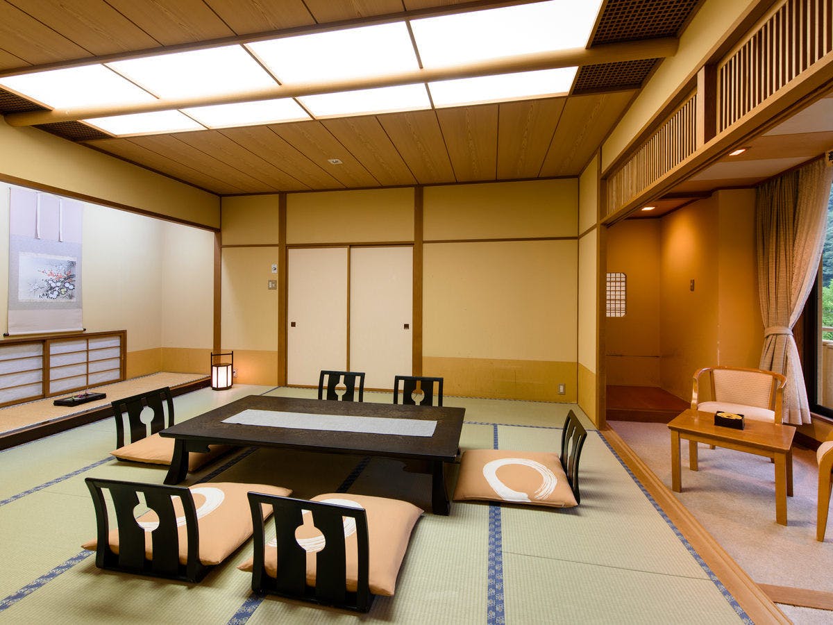 和心を取り入れた、モダンなベージュ基調のお部屋です。空間を贅沢に使用した清潔感ある床の間、空調口部の洒落た格子枠、寛ぎの掘りごたつなど、床から天井の細部に至るまで木材をふんだんに使用し、優しい雰囲気作りを大切に致しました。目の前に広がる山々の迫力と、のどかな奥久慈の風情を余すところなくご堪能頂ける、開放感ある大窓とバルコニーも併せてお楽しみ下さい。