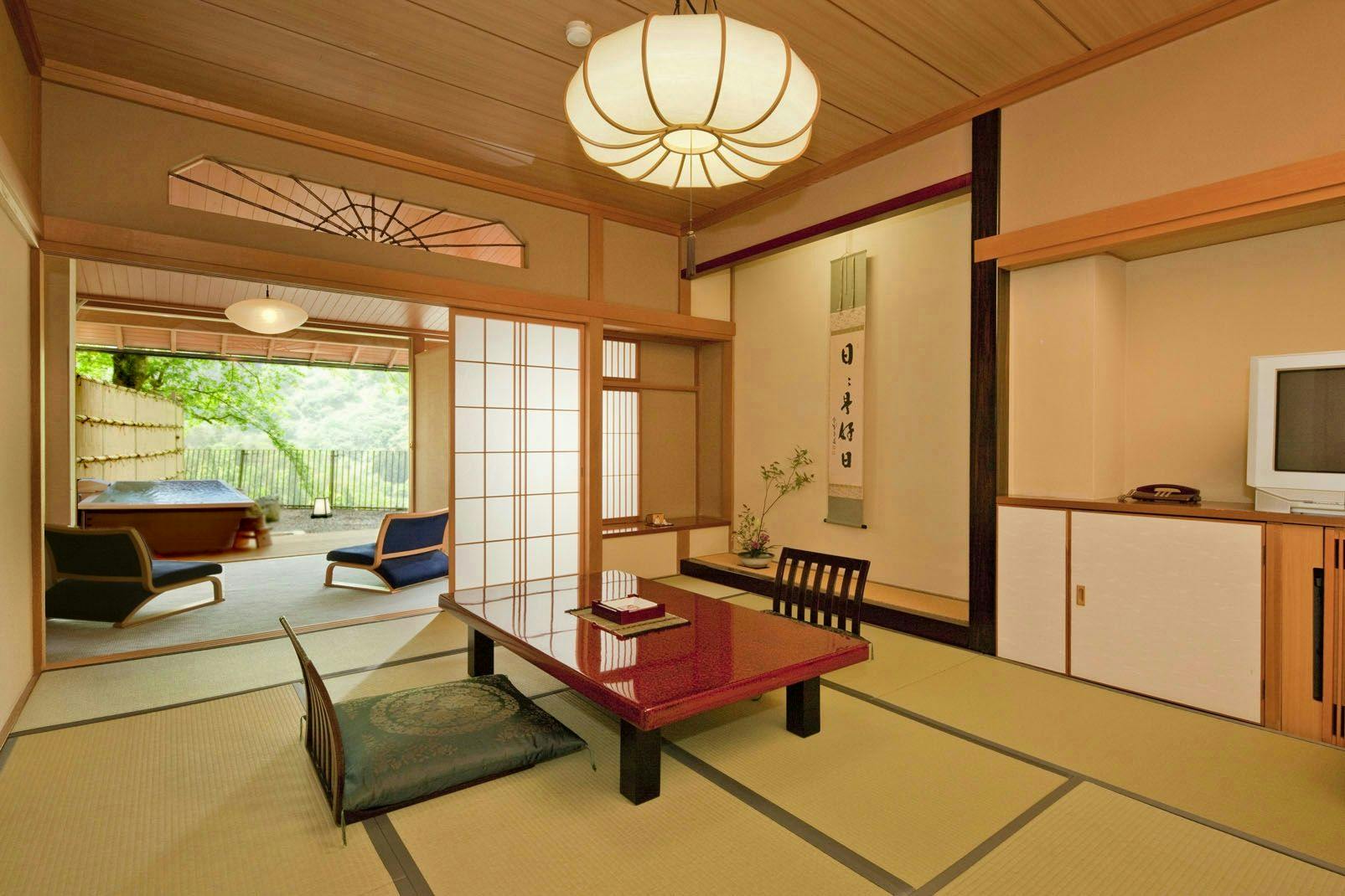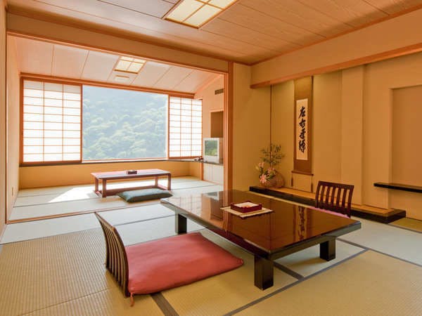 和室12畳+広縁、40平米の広々タイプ。テラスに源泉掛け流し、檜の露天風呂がございます。