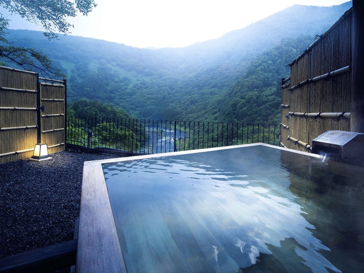 渓流沿いに佇む老舗宿。プライベートなひとときを満喫できる源泉かけ流しの露天風呂付き客室が人気です。