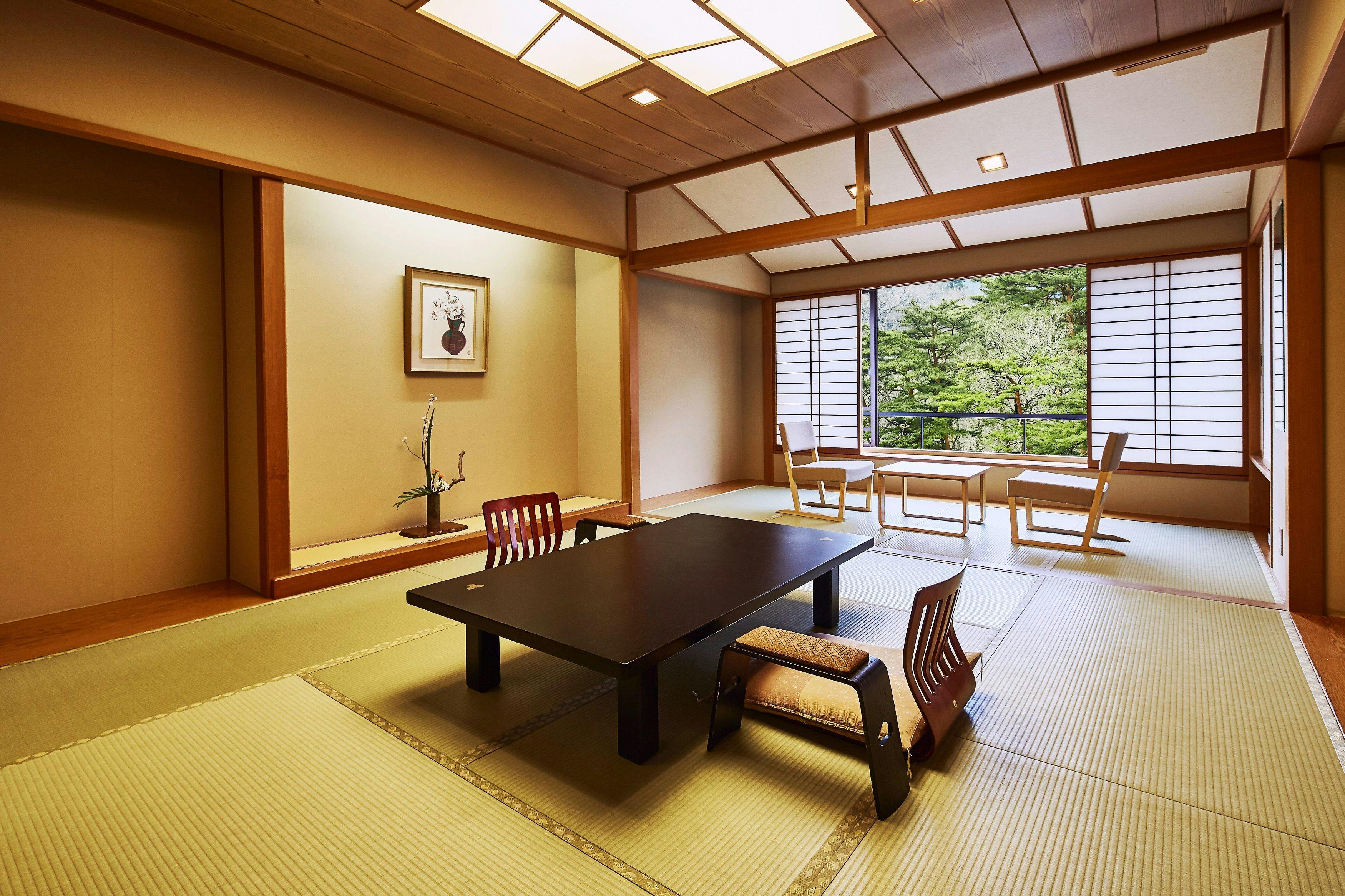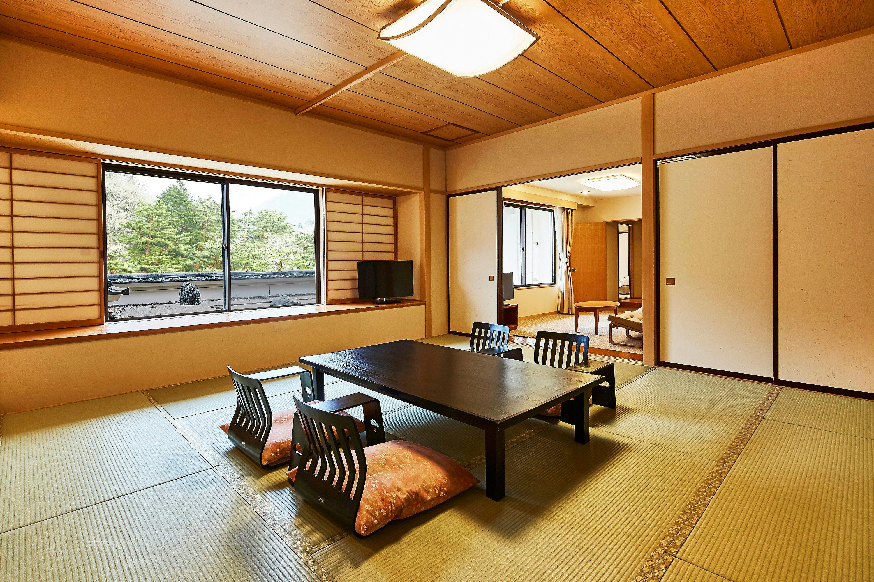 窓からは広がる山々の四季を楽しめる本館「月見亭」。ツインベッドルーム、和室12.5帖、リビングルーム、洗面台2つを備えた特別室です。リビングルームは二次会場所に最適です。