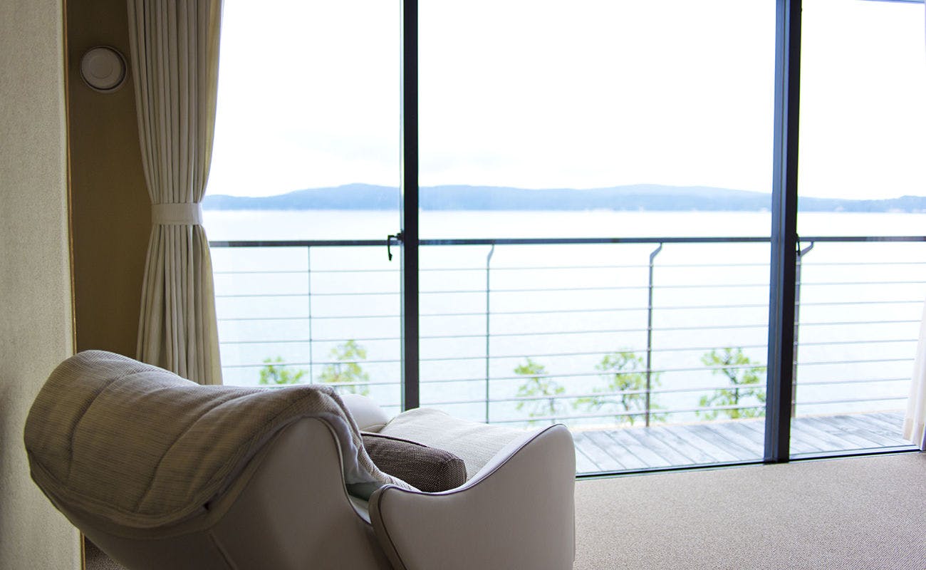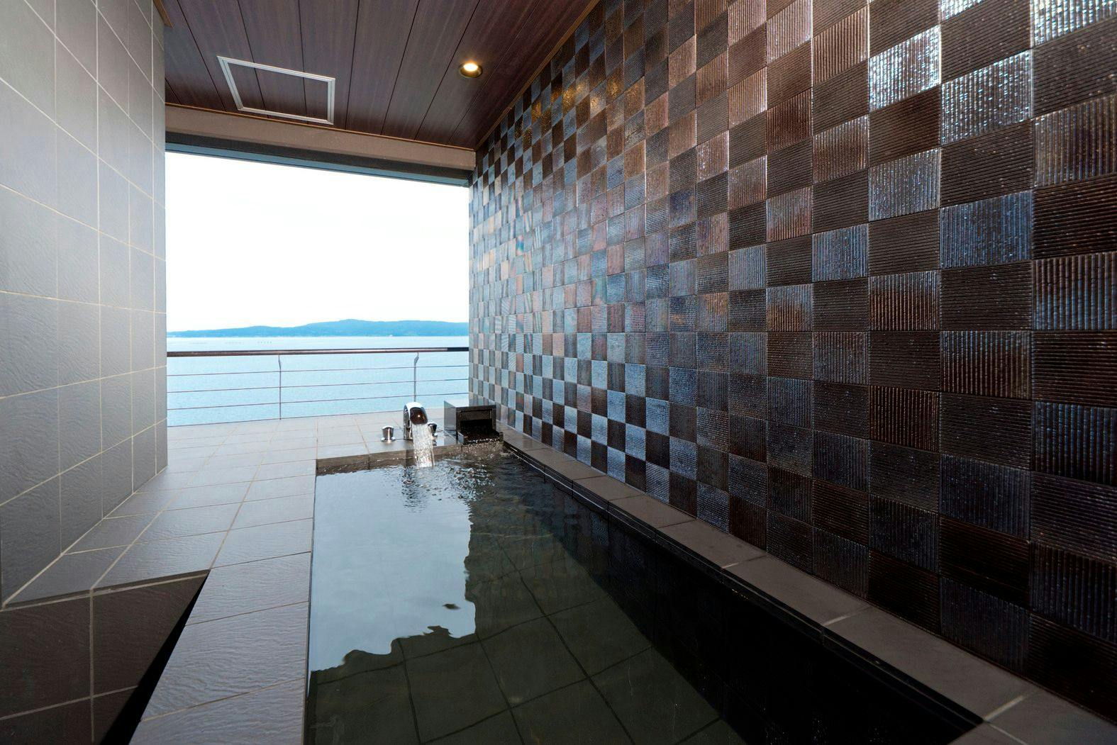 オーシャンビューの寛ぎと癒しの空間。バスルームは海に面し、大きな窓からは穏やかな七尾湾の眺望をご覧いただけます。温泉を使用しておりますので、お部屋でゆっくりといで湯情緒をお楽しみくださいませ。
