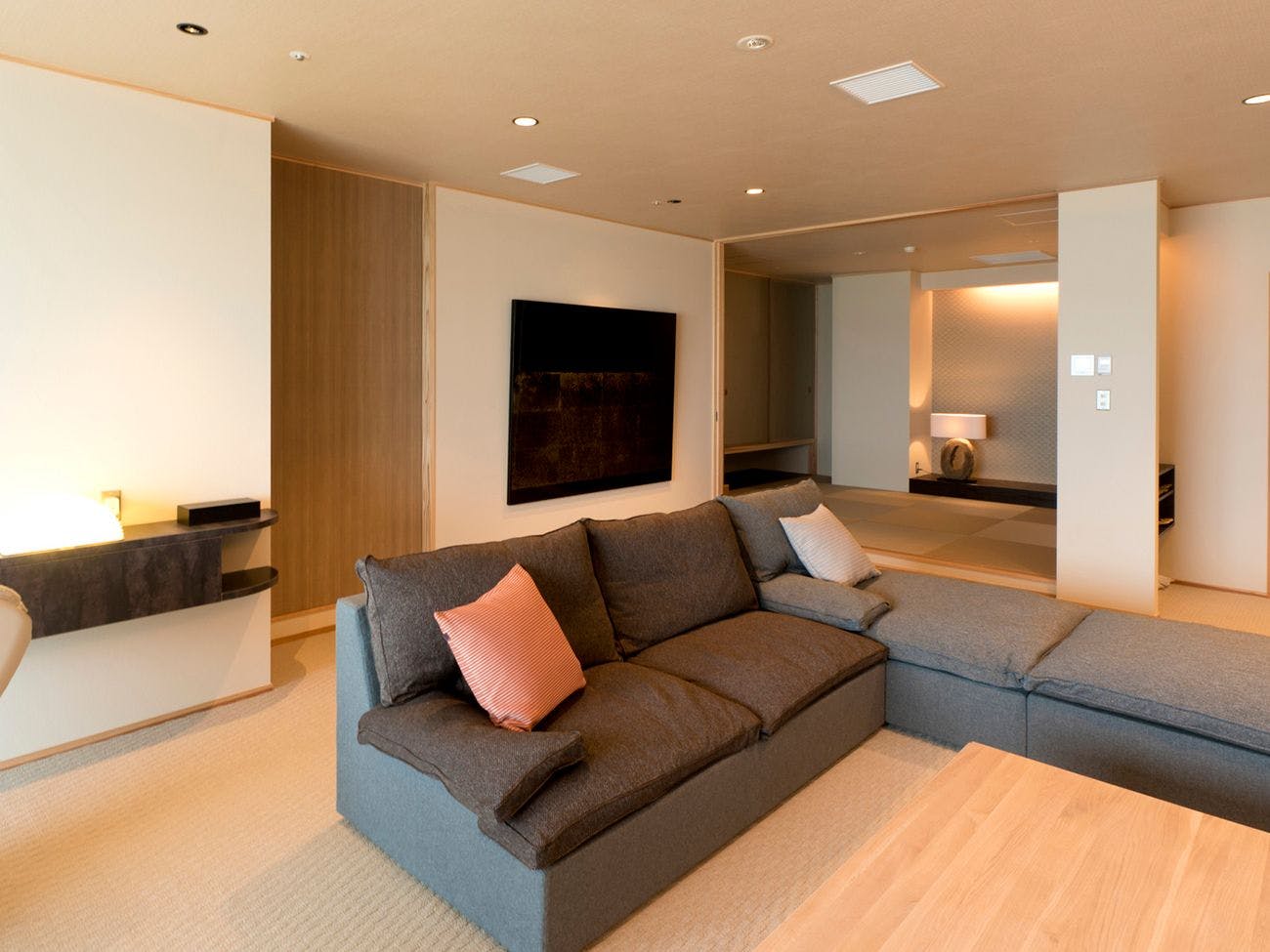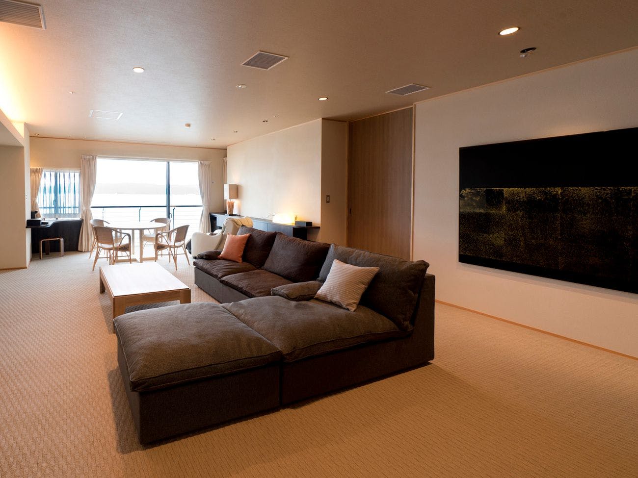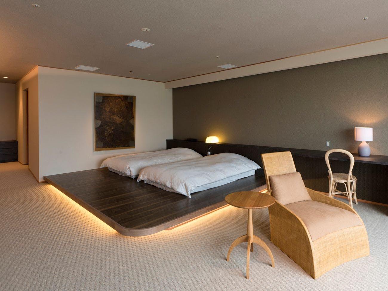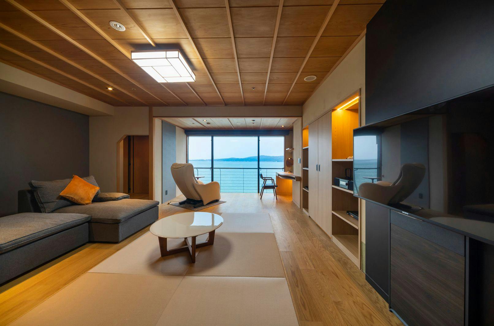 オーシャンビューの寛ぎと癒しの空間。【和】を残しながら現代的にアレンジされたベッドとソファの客室。美しい景色をご覧いただきながらゆっくりとお寛ぎいただける空間です。