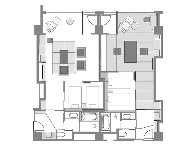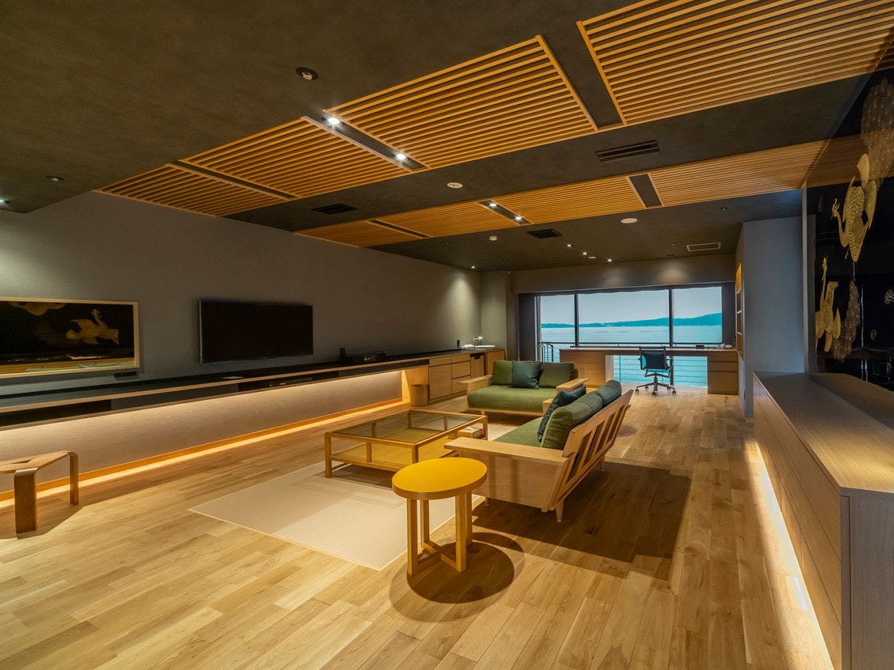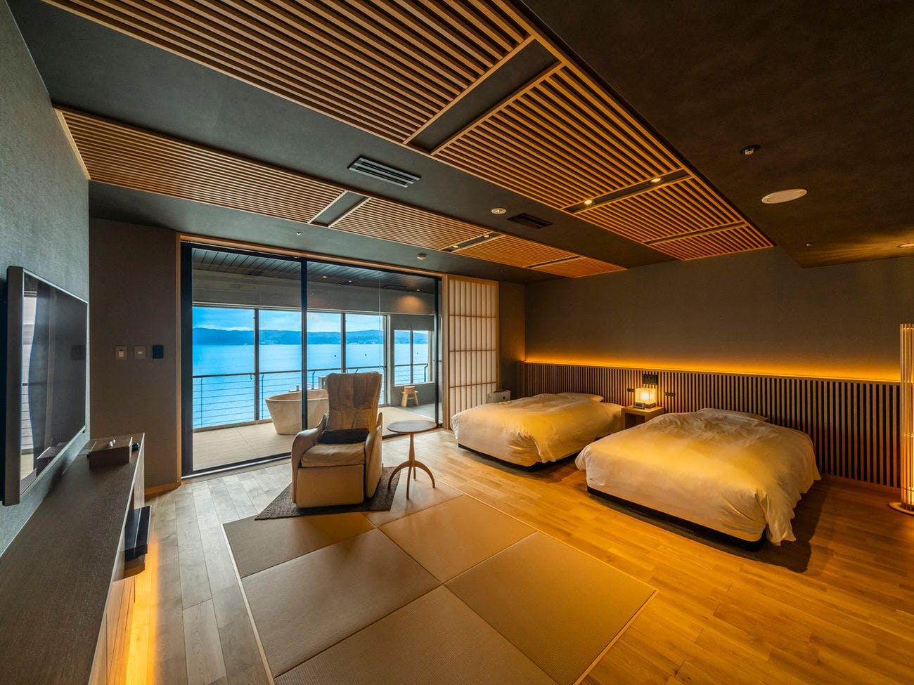 オーシャンビューの寛ぎと癒しの空間。広々とした洋間と和室、ベッドルームがあり、ゆったりとお寛ぎいただけるお部屋です。露天風呂には温泉を使用しておりますので、お部屋でいで湯情緒をお楽しみいただけます。