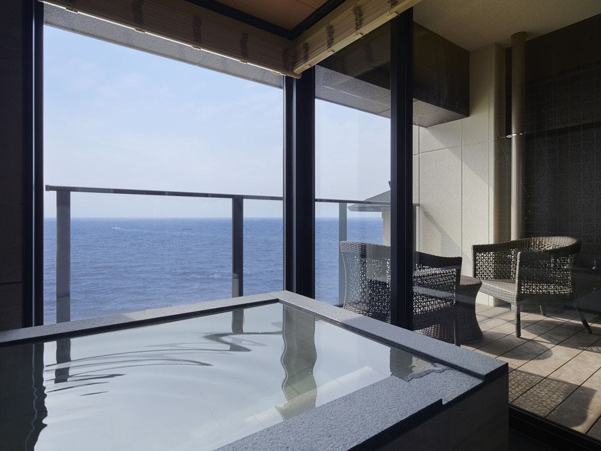 東京湾に面したオーシャンビュー、最大4名様定員・テラス&半露天風呂付の和洋室です。禁煙室となりますので喫煙される場合は館内の喫煙所のみとなります。