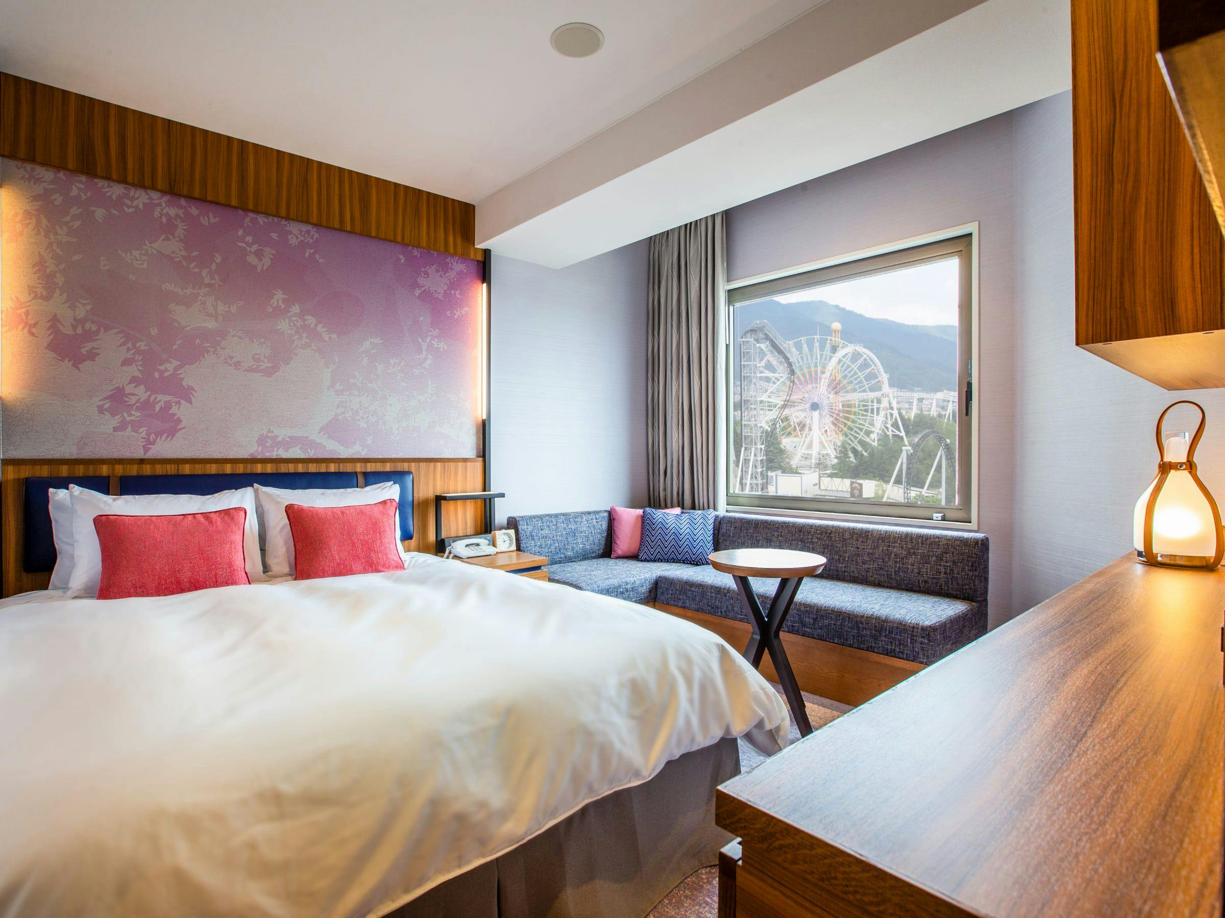 厚みのあるキングサイズのベッドで極上の眠りを。眼下には遊園地の魅力的な眺望を見渡すことができます。客室の至る所に織り交ぜた木のぬくもりと無機質な富士急ハイランドとの調和がハイセンスで上質な雰囲気をたたえます。