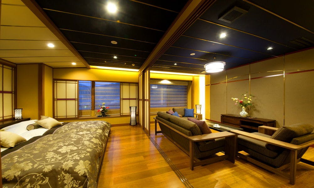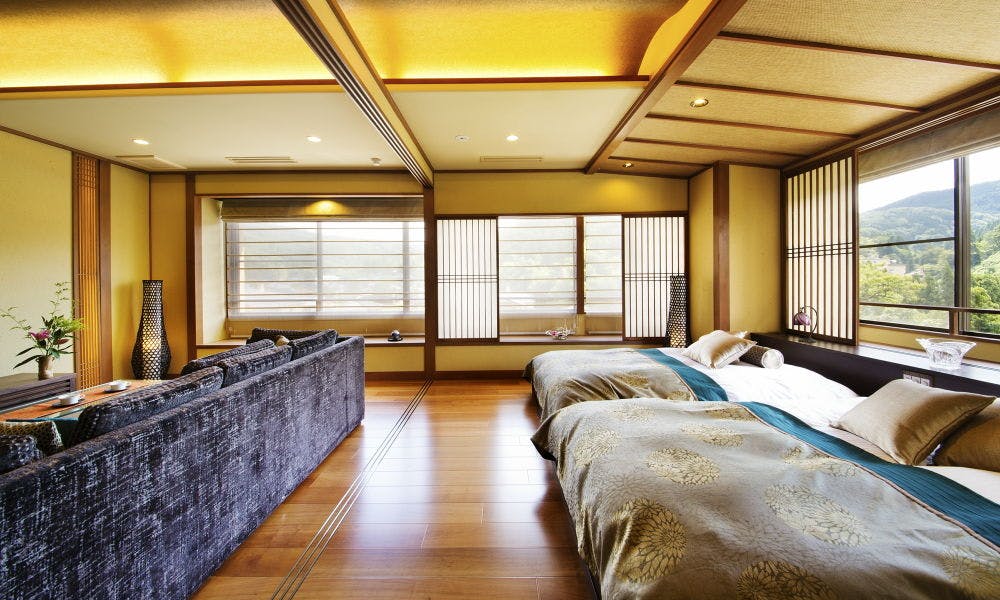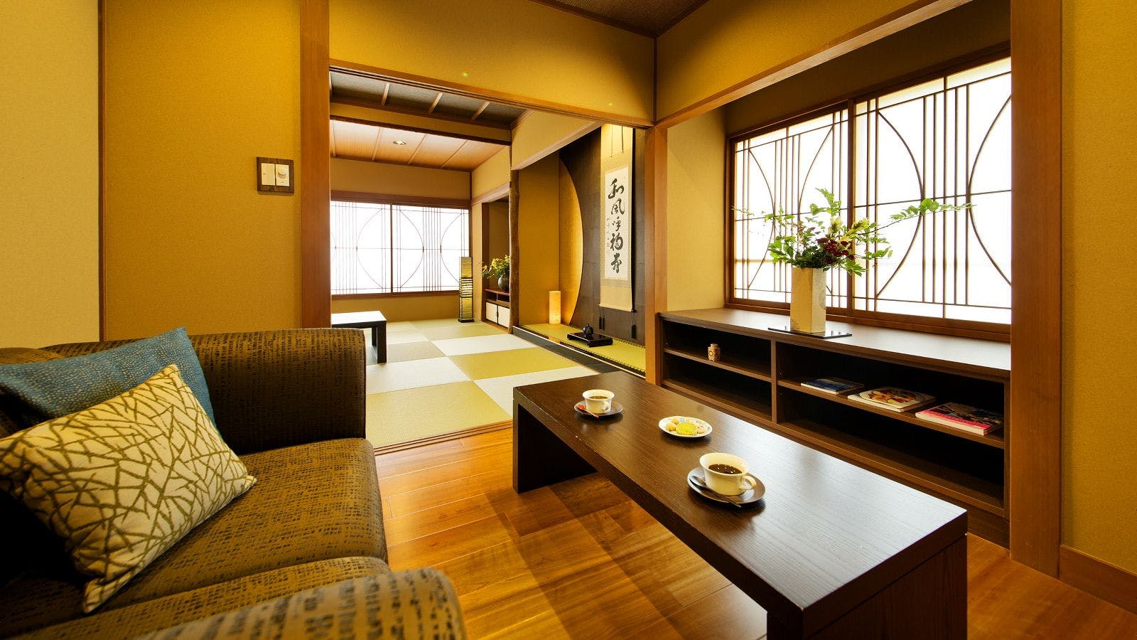 和室・リビング・ベッドルームを備えたゆとりのスイートは、まさに極上のくつろぎ空間。細やかなおもてなし心にあふれた上質なぬくもりに包まれ、百楽荘ならではの大人の休日をごゆっくりと・・