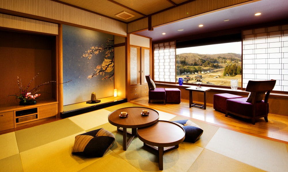 ゆとりのある開放的な和室で、くつろぎのひとときがお過ごしいただけます。窓の外に広がる四季おりおりの情景。大切な人と話すゆたかな時間。小さな宿ならではの行き届いたサービスを大切にいたします。