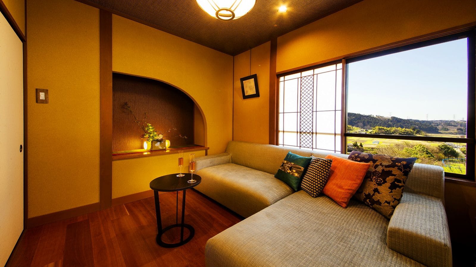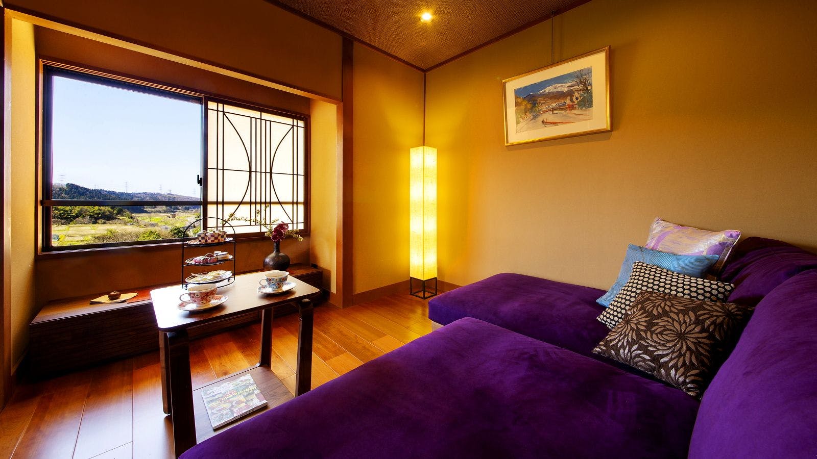 モダンなしつらえと艶やかさを色深く取り入れた特別室。窓の外には対照的にゆっくりとした時の流れにどこかほっこりするRural viewをお楽しみ頂けます。相反する「ふたつの美」が紡ぐ特別な時間をお楽しみください