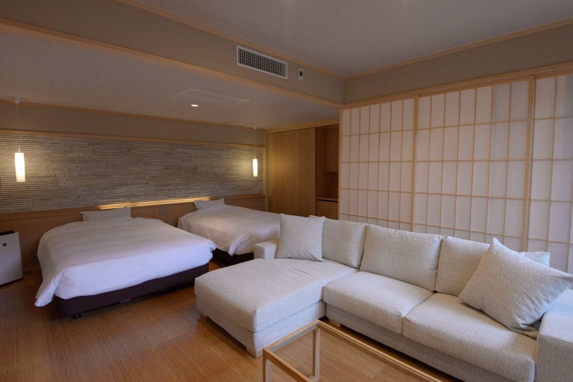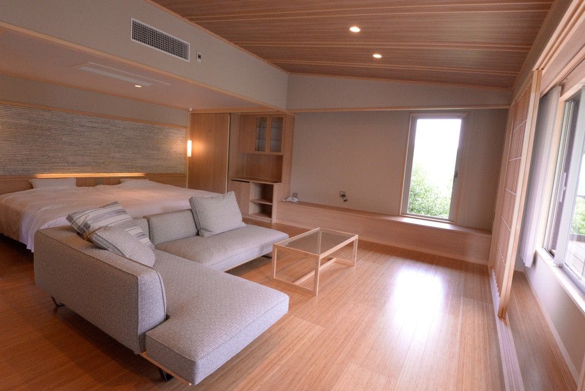 雄大な煙を上げる源泉塔を遠く眺める、和の趣を感じる和室と機能的なベッドルームを備えた60平米のお部屋です。(森・山の景観はございません。予めご了承下さい。)