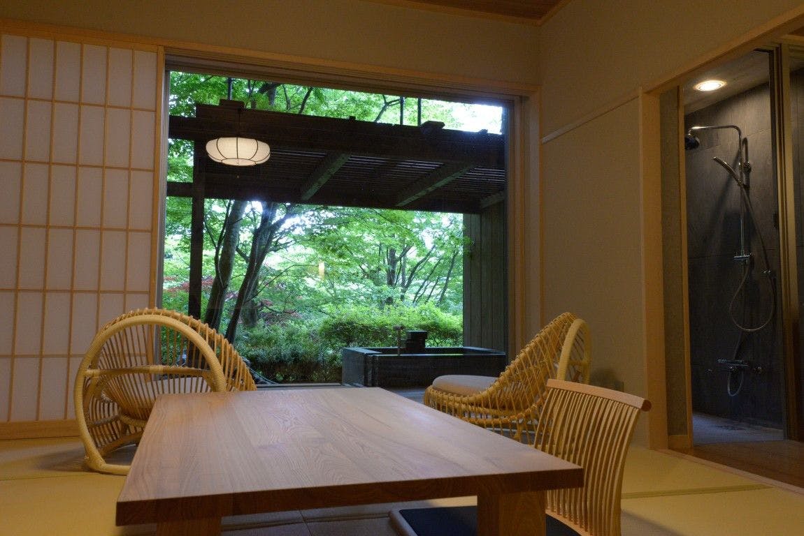 趣溢れる和室と機能的なベッドルームを備え、お部屋から広大な自家自然園の雄大な借景を望めるゆったり70平米のお部屋です。
