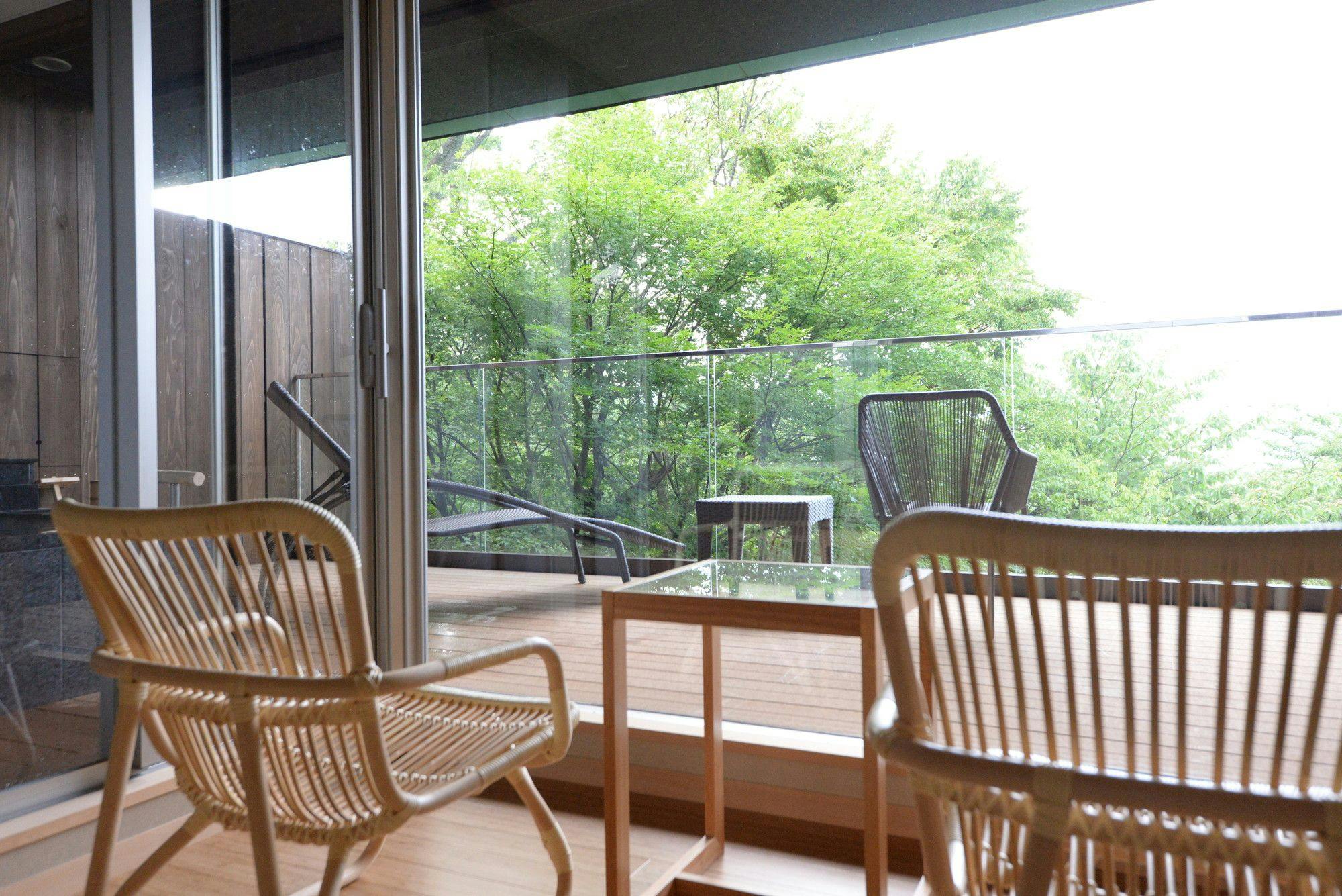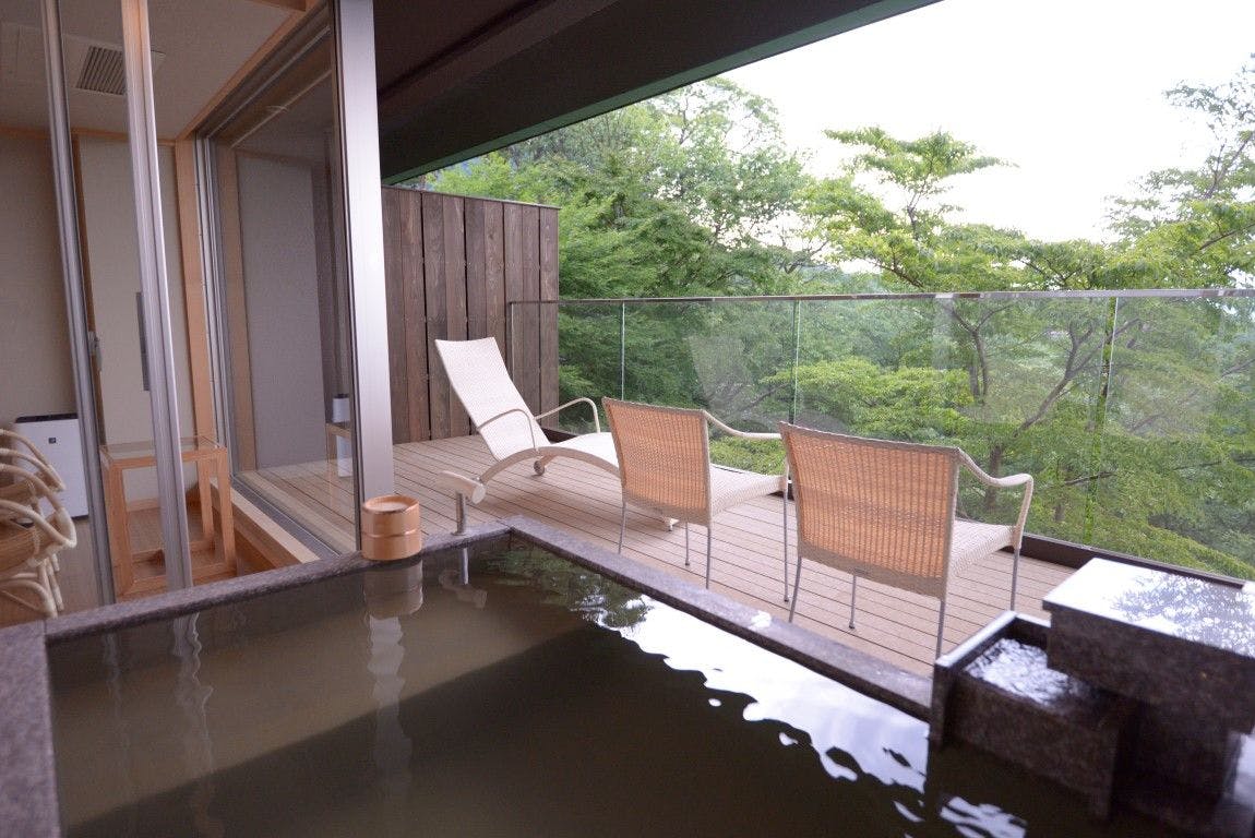 機能的なベッドルームに広々デッキと露天風呂を擁した2名様向けのお部屋です。自然園側、源泉塔側どちらかの借景をお楽しみ頂けます。(※景観のご指定は頂けません)