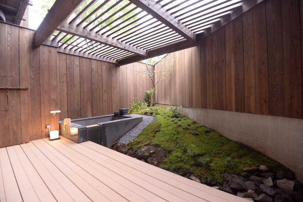 大きめな露天風呂に、ゆったりとしたデッキソファ&チェア細やかで大胆な和のしつらい溢れる和室と、おもてなしの心を随所に散りばめたベッドルーム。ゆったりとお泊り頂ける当館最上級100平米のお部屋です。