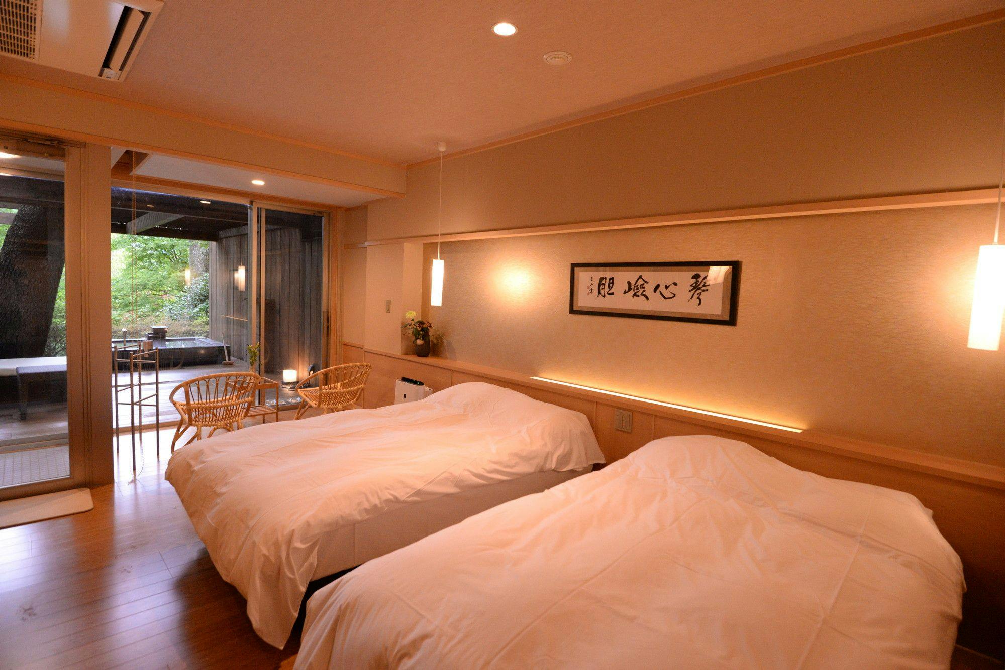自然園と箱根連山の借景を存分に堪能できる、絶景の洋室ベッドルームのお部屋です。