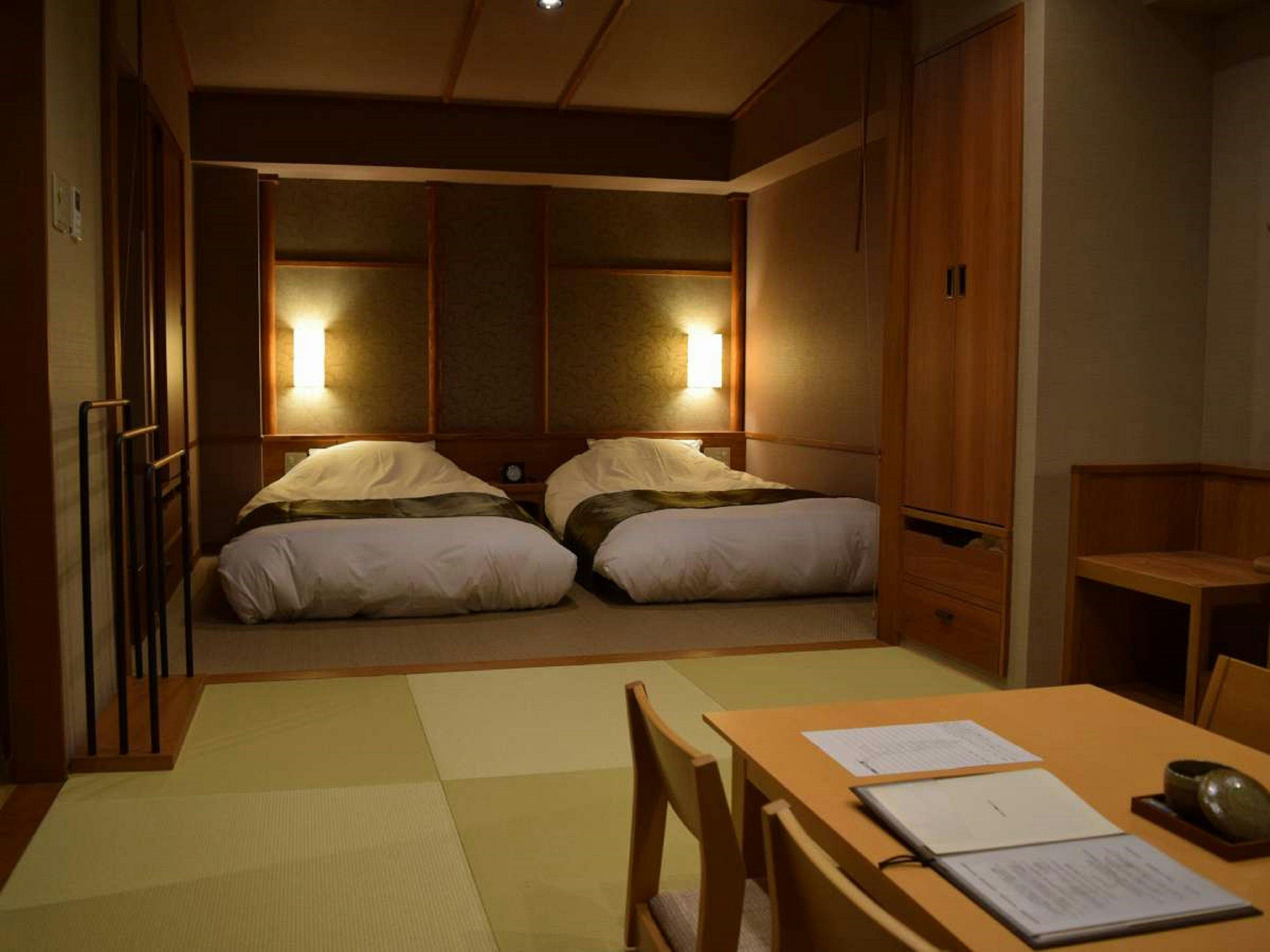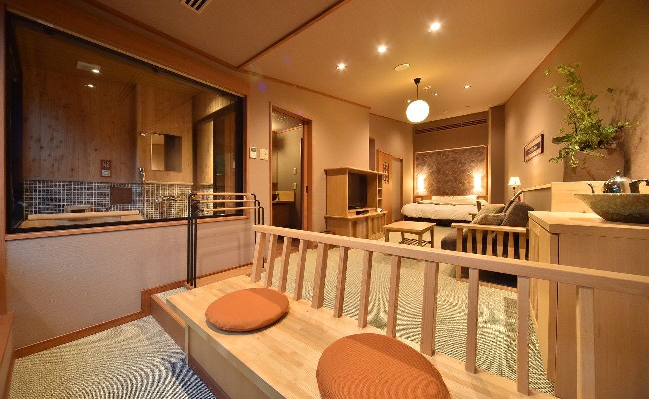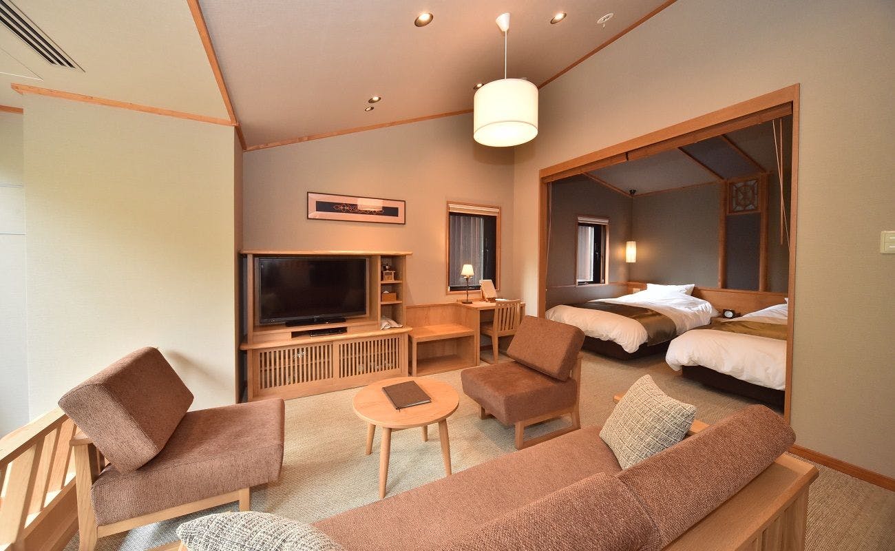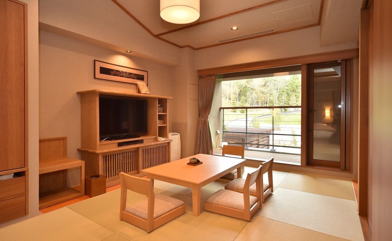 当館唯一の和洋室。幅110cmの和ベッド2台とダブルベッド(シモンズ製)1台の2つのベットルーム、多機能にご利用いただける和室リビングにバルコニーを備えております。和室リビングを備え、バルコニー・2つの化粧洗面台を配置し、51平米でゆとりの空間を持つお部屋です。和室リビングにお布団2組とダブルベッドに2名様がお休みいただき、最大6名様までご利用できます。天然温泉の浴槽も85×150cmのゆったりサイズとなり極上の湯浴みをお愉しみいただけます。阿寒川をご覧いただくことが出来ませんが二世代家族でのご利用やグループ、女子旅と使い方はご自由です。和洋室ならではの和のぬくもりと天然温泉を存分にお愉しみください。