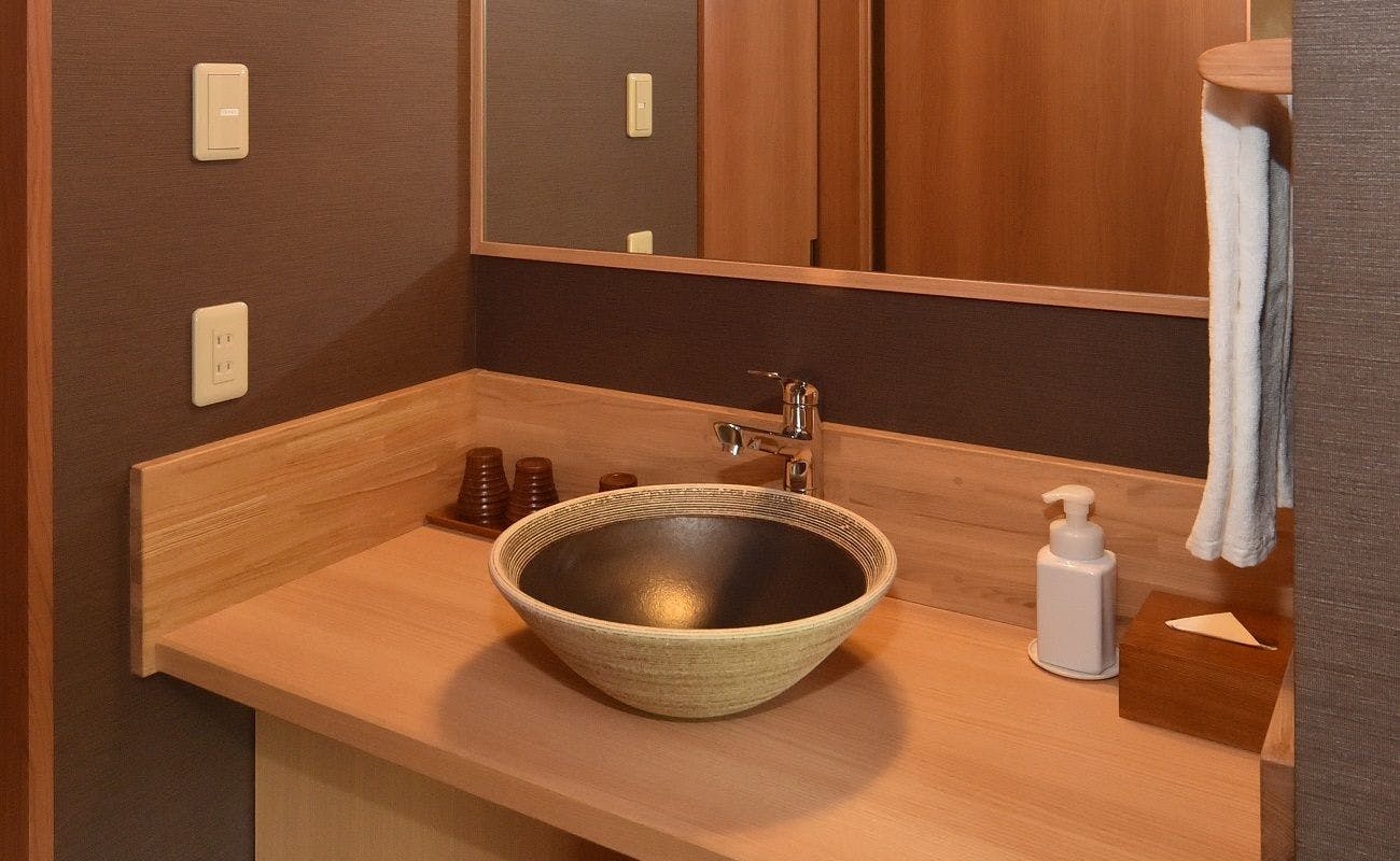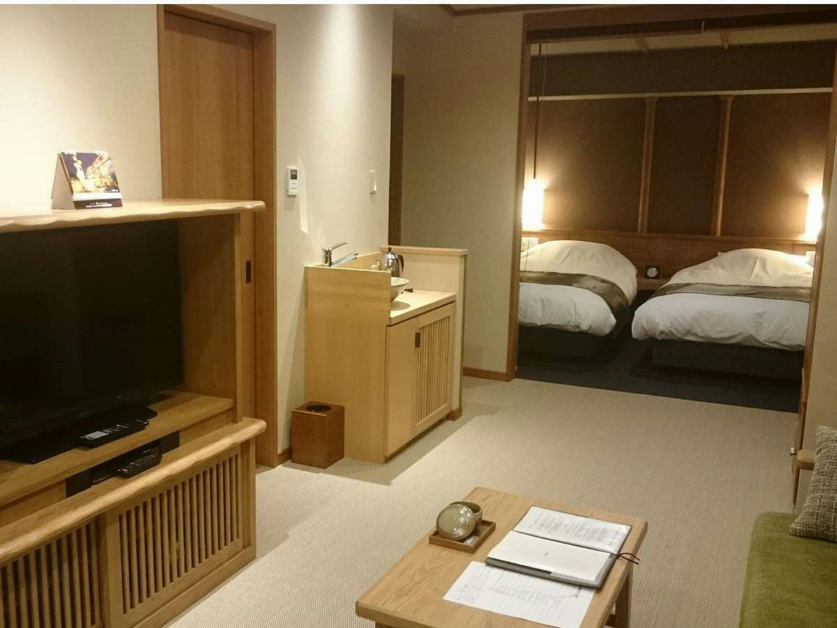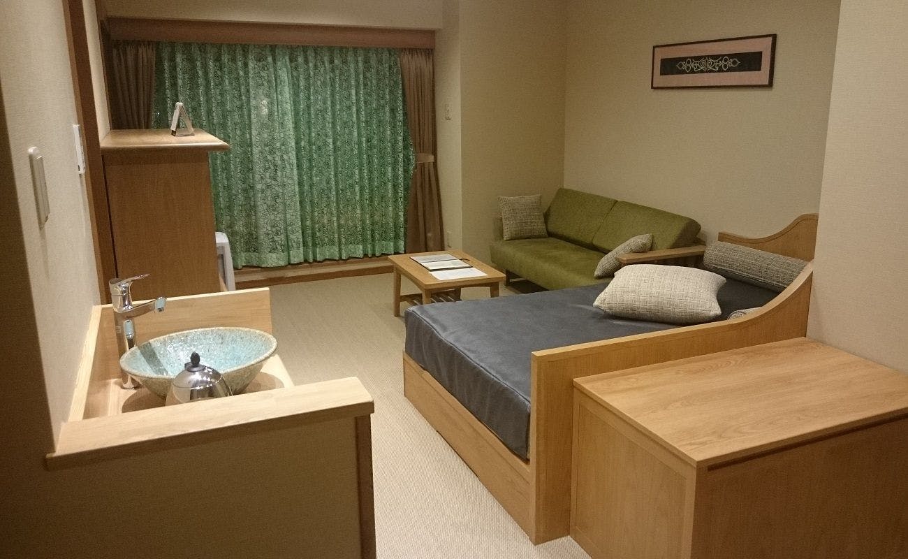 当館唯一の和洋室。幅110cmの和ベッド2台とダブルベッド(シモンズ製)1台の2つのベットルーム、多機能にご利用いただける和室リビングにバルコニーを備えております。和室リビングを備え、バルコニー・2つの化粧洗面台を配置し、51平米でゆとりの空間を持つお部屋です。和室リビングにお布団2組とダブルベッドに2名様がお休みいただき、最大6名様までご利用できます。天然温泉の浴槽も85×150cmのゆったりサイズとなり極上の湯浴みをお愉しみいただけます。阿寒川をご覧いただくことが出来ませんが二世代家族でのご利用やグループ、女子旅と使い方はご自由です。和洋室ならではの和のぬくもりと天然温泉を存分にお愉しみください。