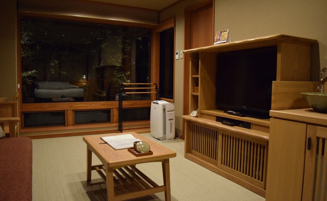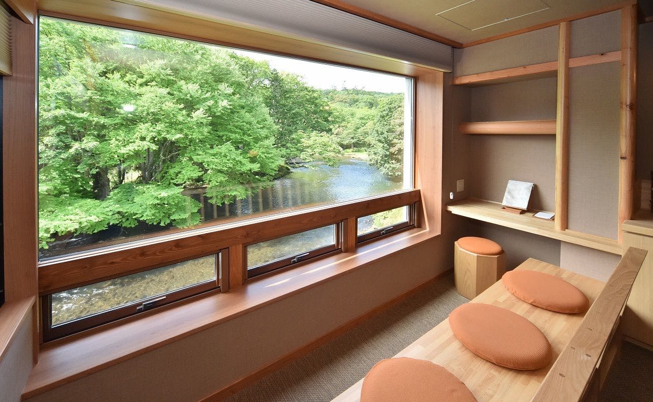 阿寒川に面し、トリプルタイプのお部屋では最も広い空間を持ち、ベッドルームに幅110cmのベッド(シモンズ製)2台とリビングにはダブルベッド1台とソファーを配置し、2名様では贅沢にお寛ぎいただけます。リビングのダブルベッドをご利用しますと3~4名様までご宿泊出来、二世代でのご利用でもお寛ぎ頂け、より多機能的で館内では最も部屋数の多い、全て禁煙仕様のお部屋です。阿寒川を眺めるリバービューシートから、阿寒の自然に溶け込むひと時をお楽しみください。