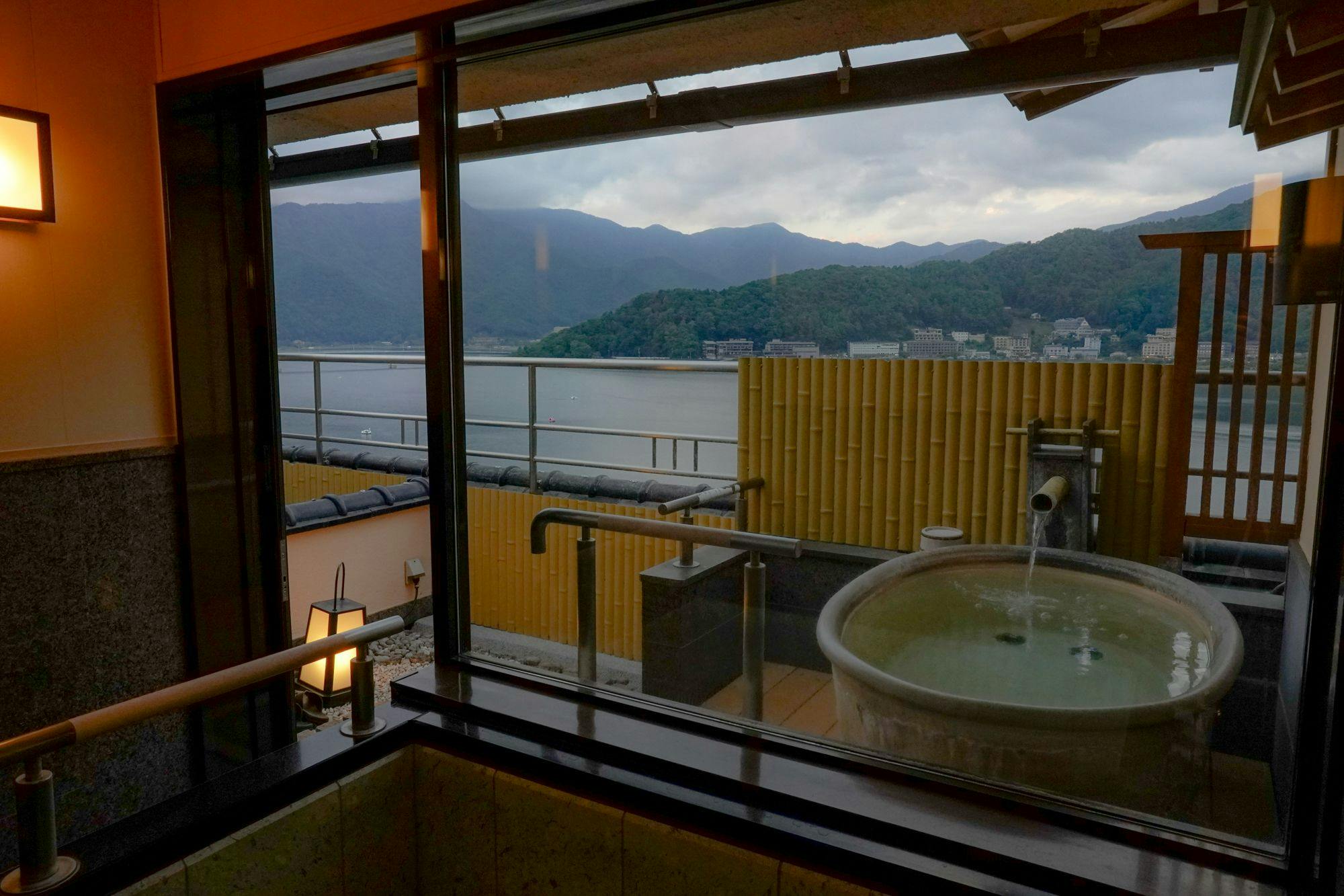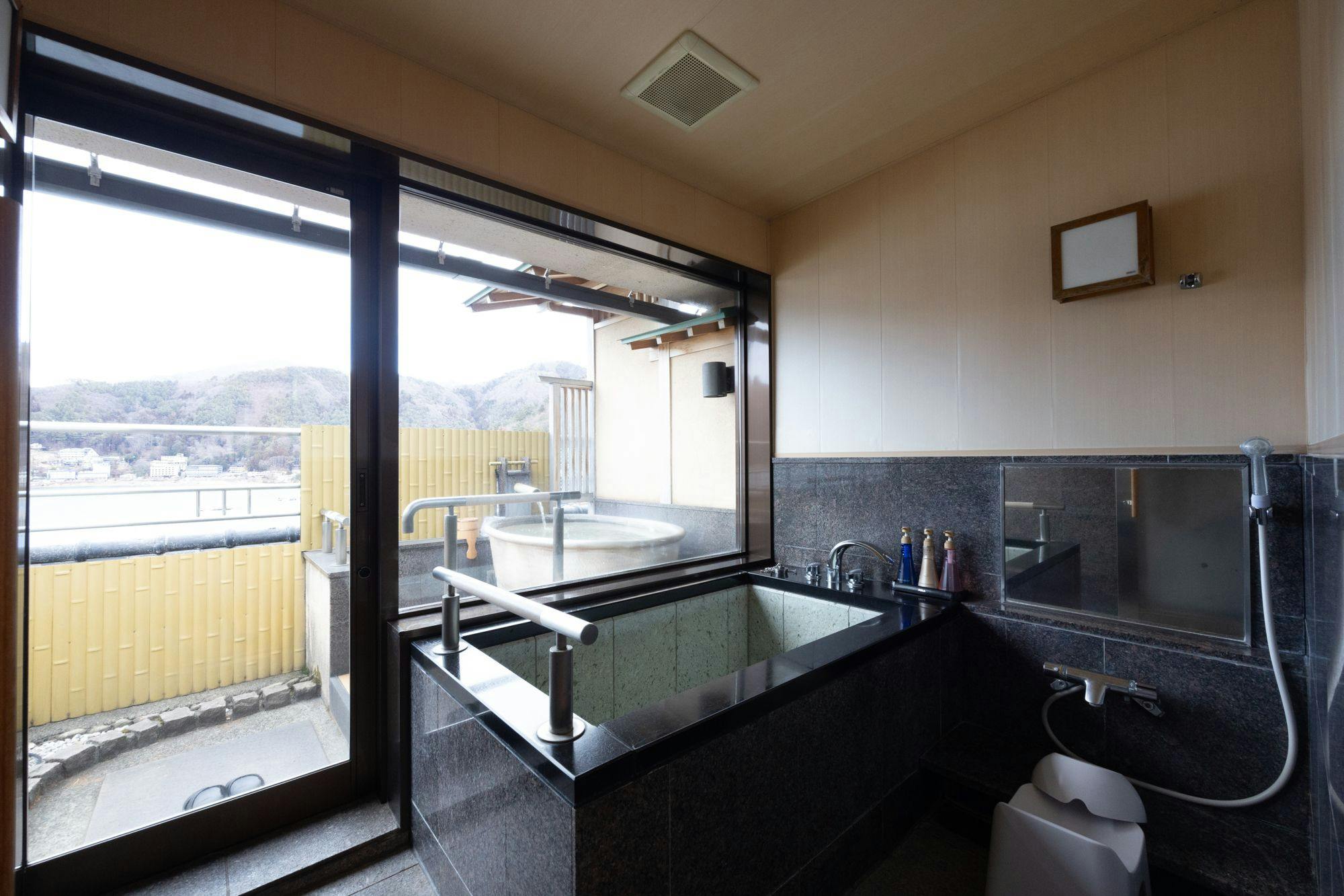 ・室内のお風呂は河口湖を望む窓がついた展望風呂となっております(※こちらのお風呂は温泉/露天風呂ではありません)。