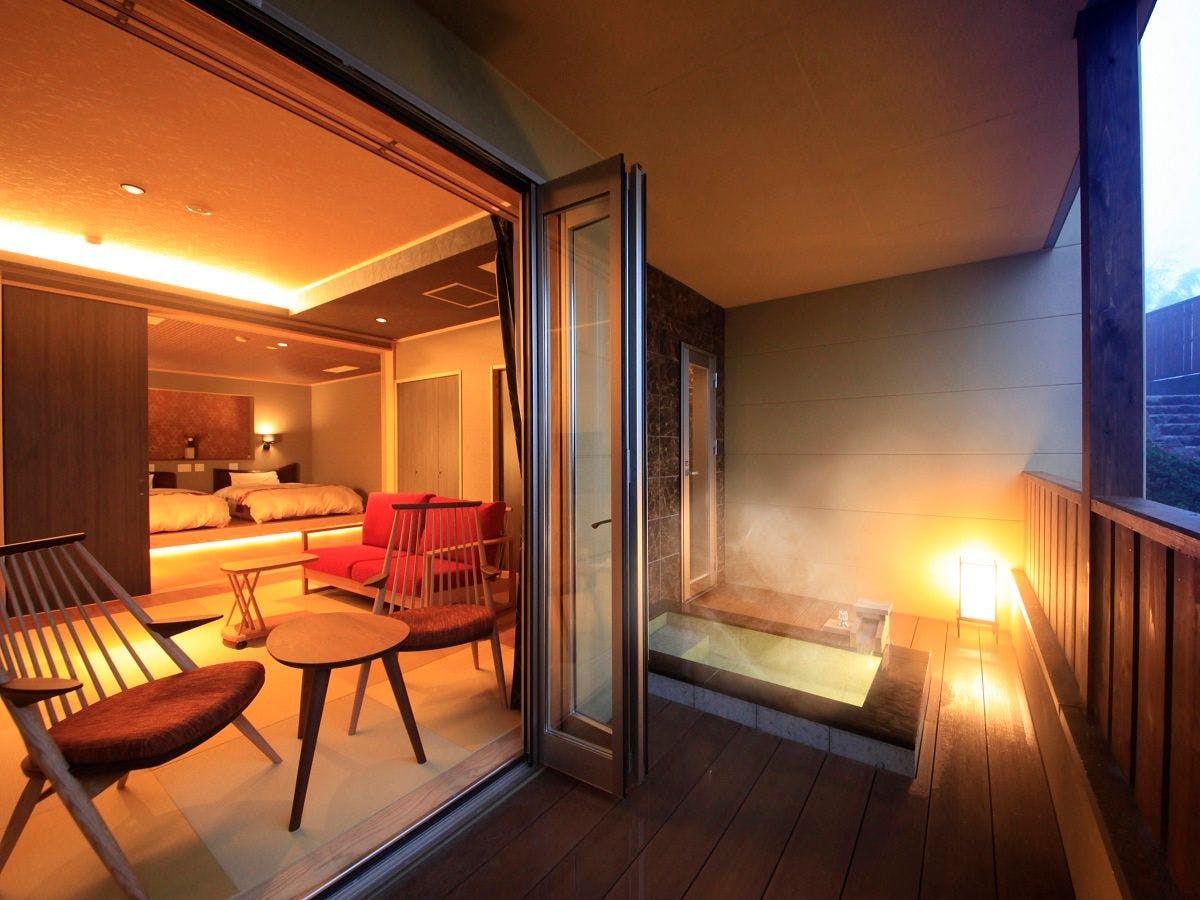 テラス部分に露天風呂と専用足湯を設置した客室。