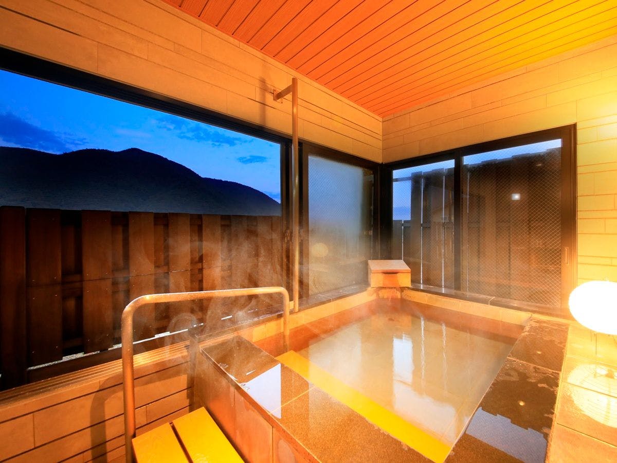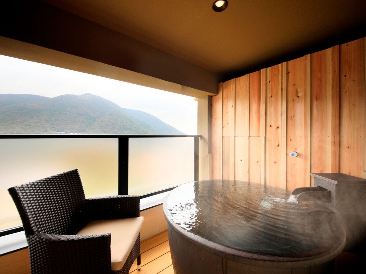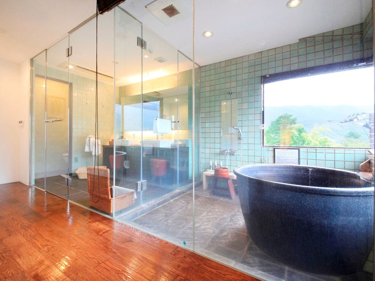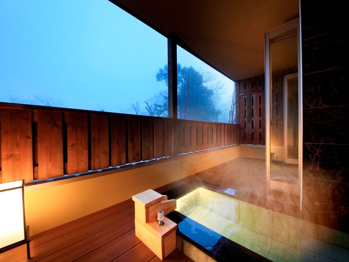 客室の半露天風呂に大涌谷温泉を引水した特別室。