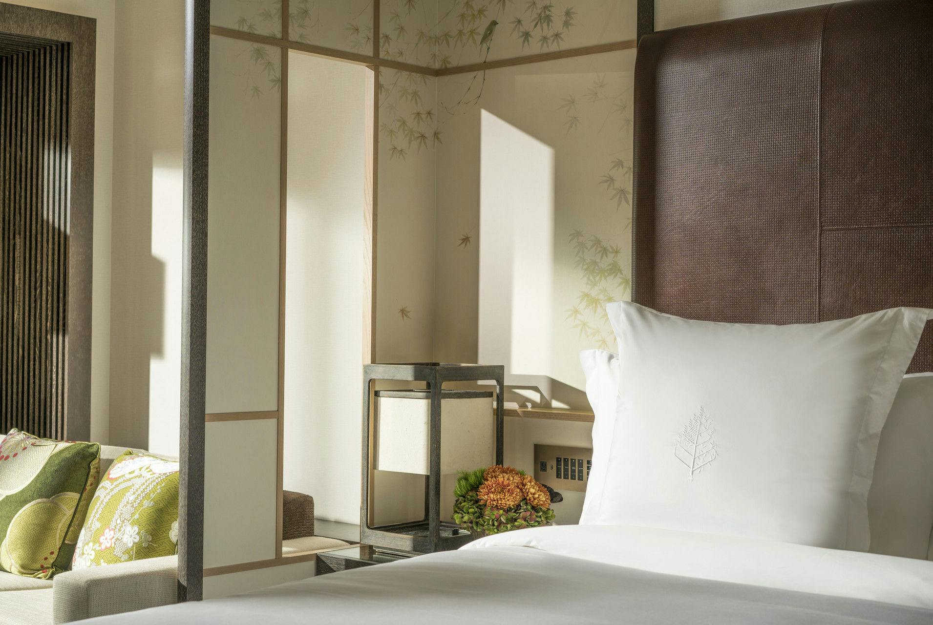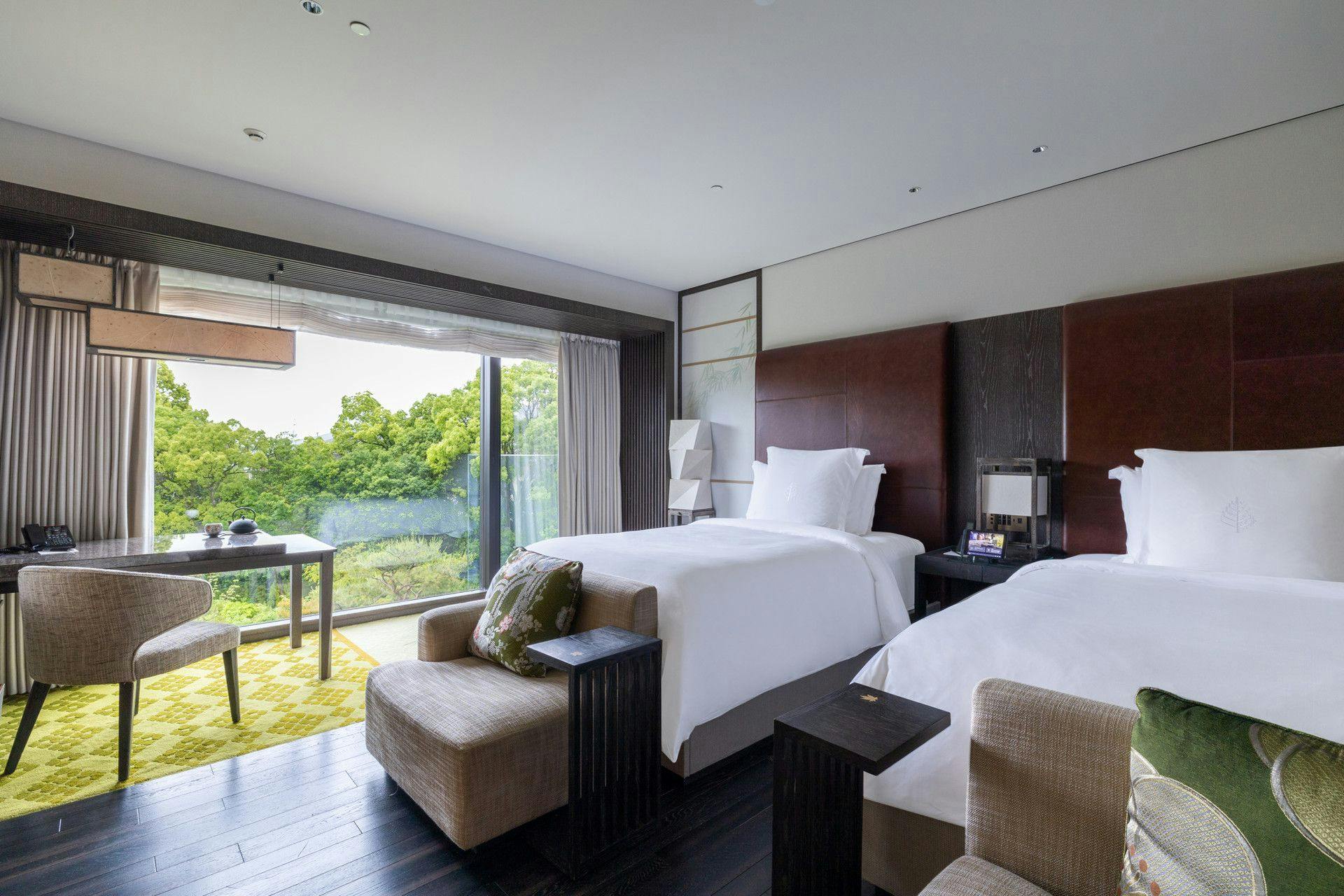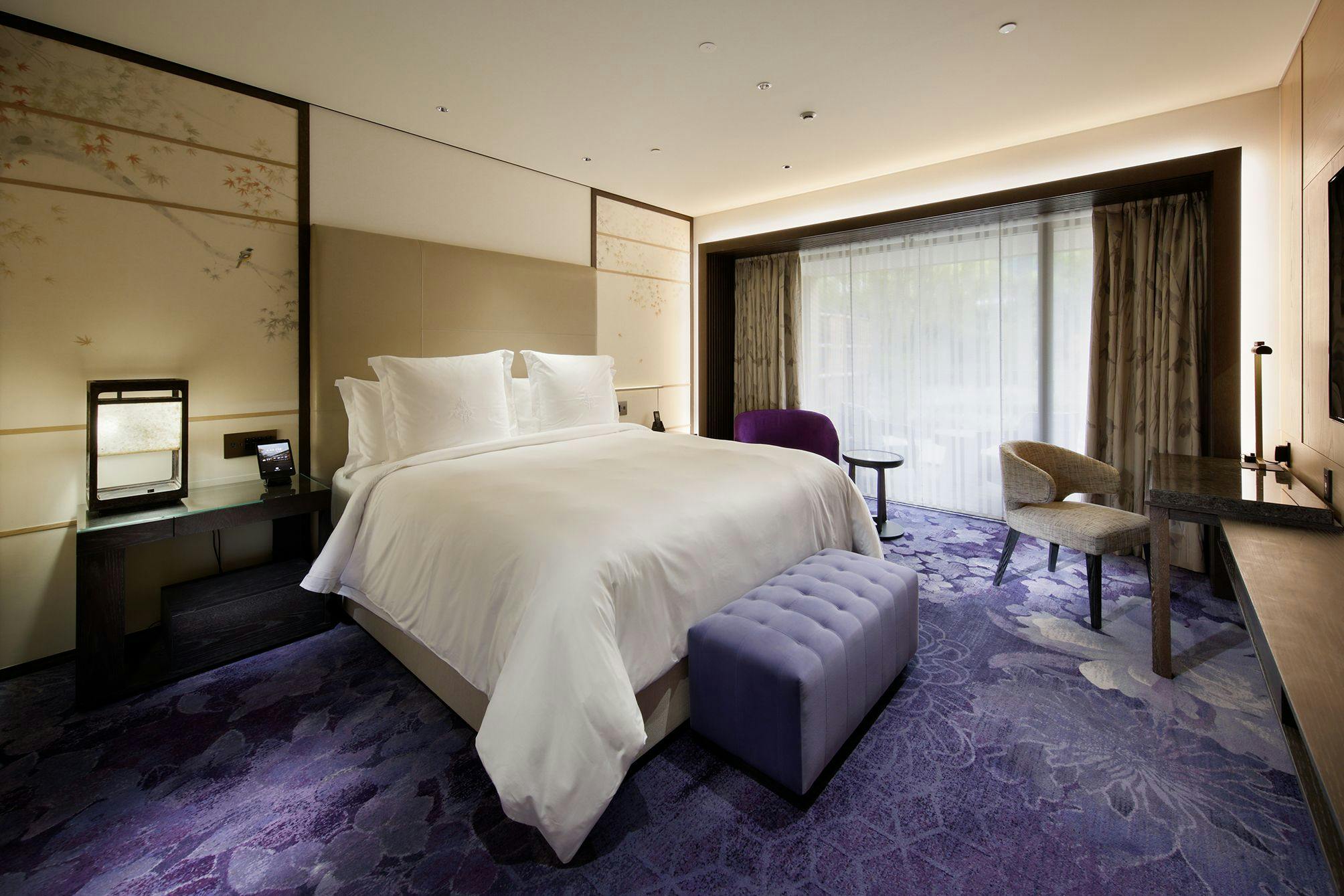 滞在する度に異なる季節の魅力を満喫できる由緒正しき名庭・積翠園を臨む52-53平米の客室。天井から床までの全面窓から堪能する庭園の美しさは格別。大理石のワーキングデスク、天然素材や京都の伝統色を随所に取り入れた上質で温もりあふれる滞在空間を演出しました。