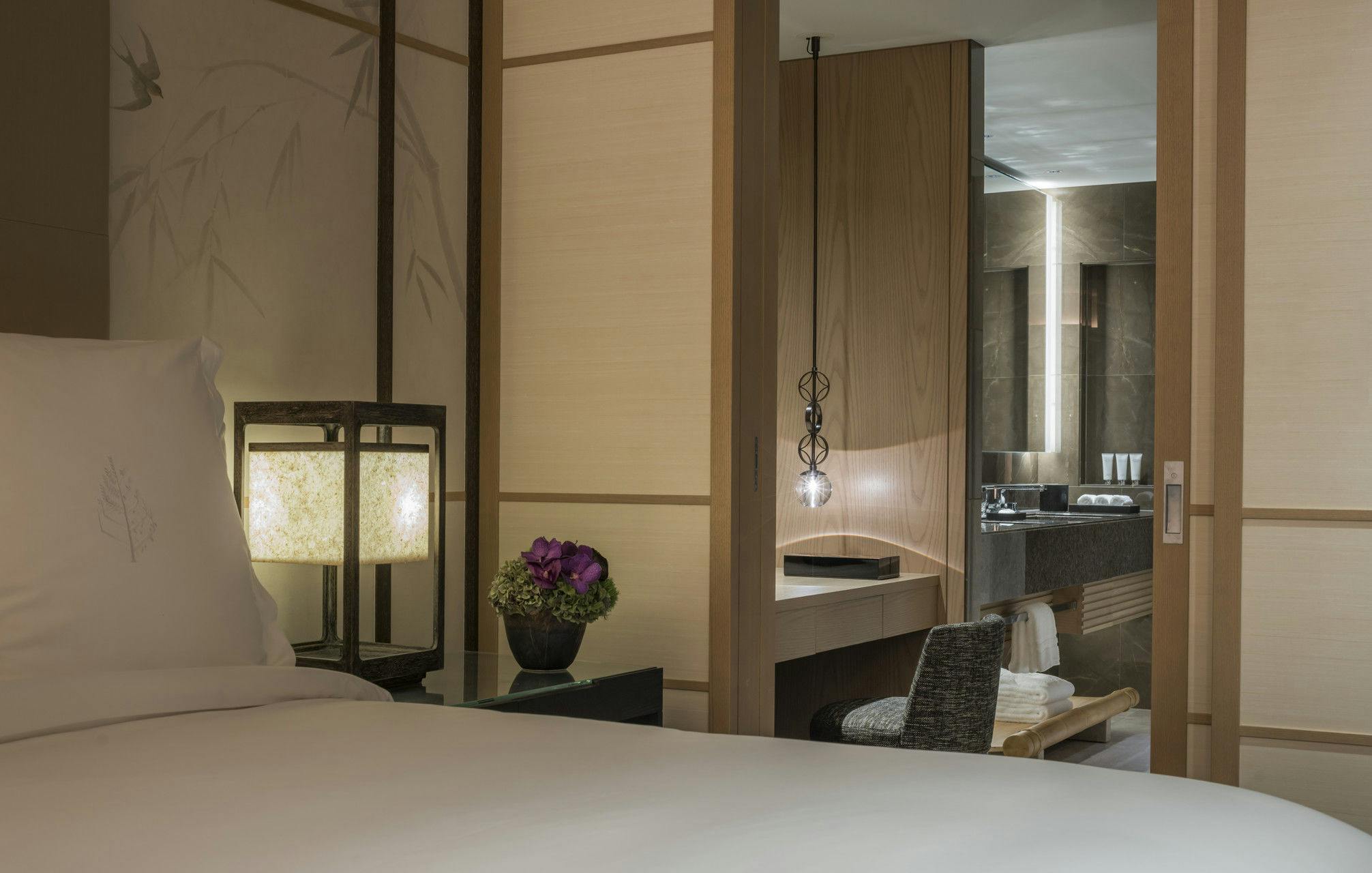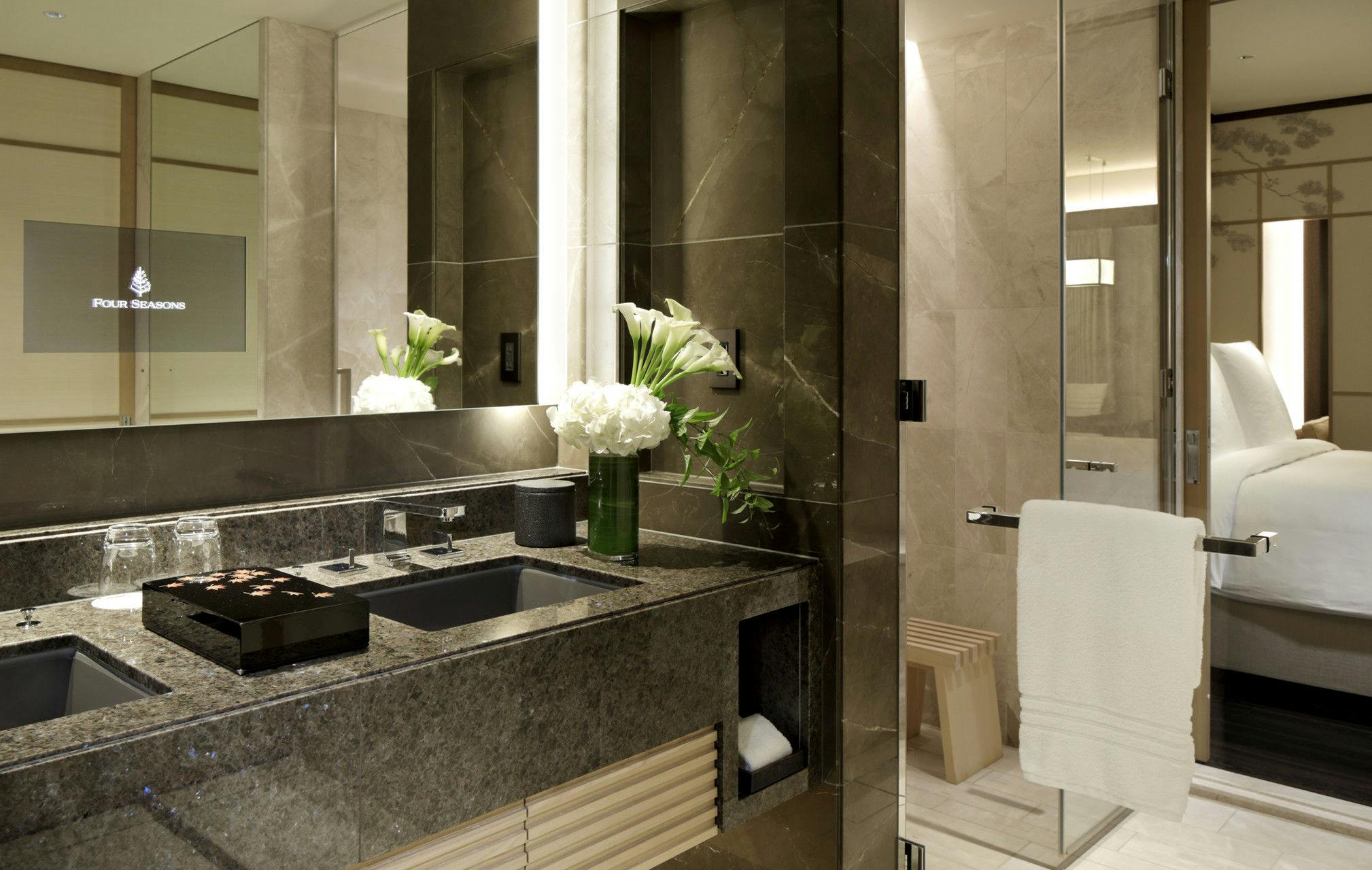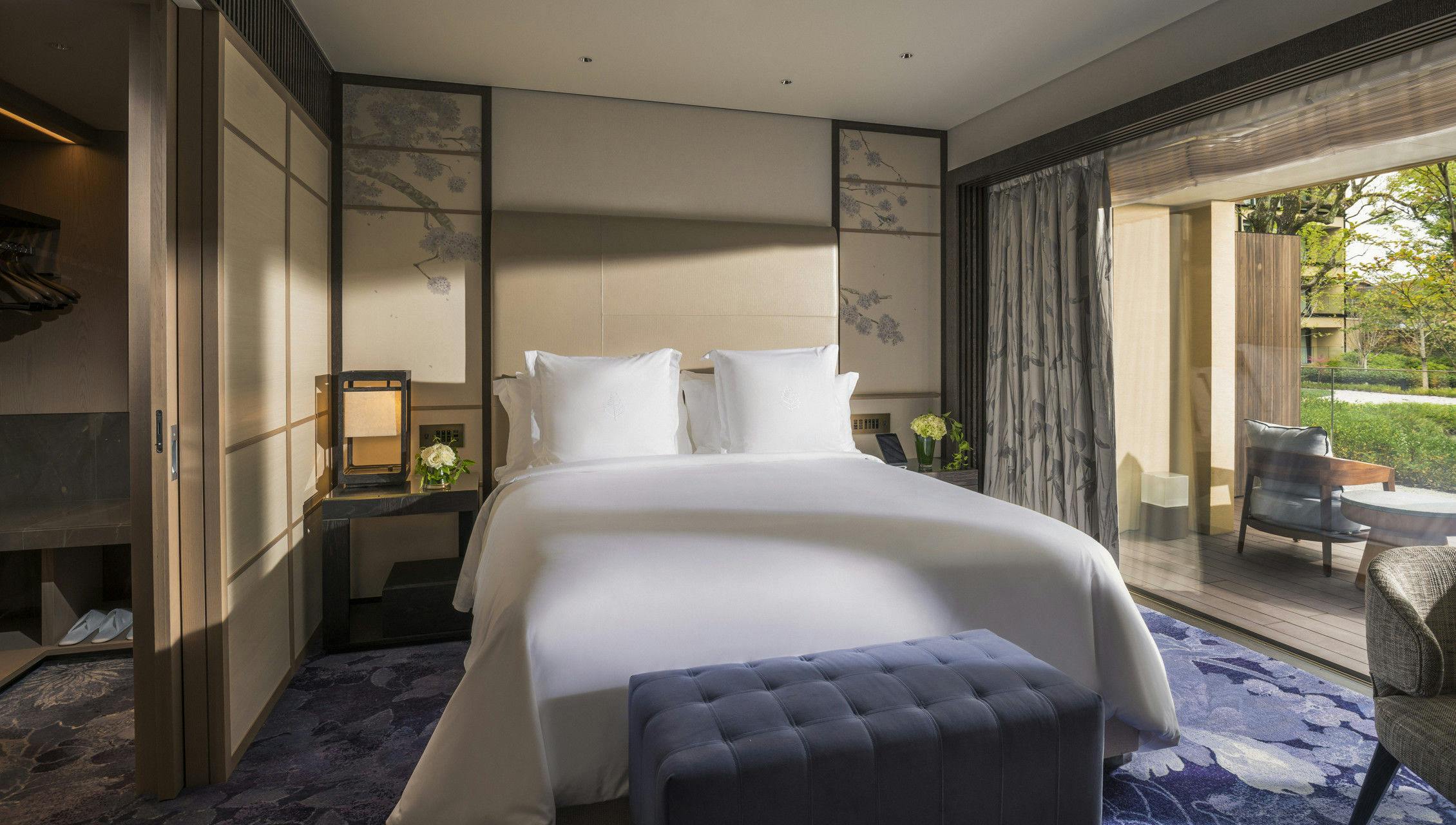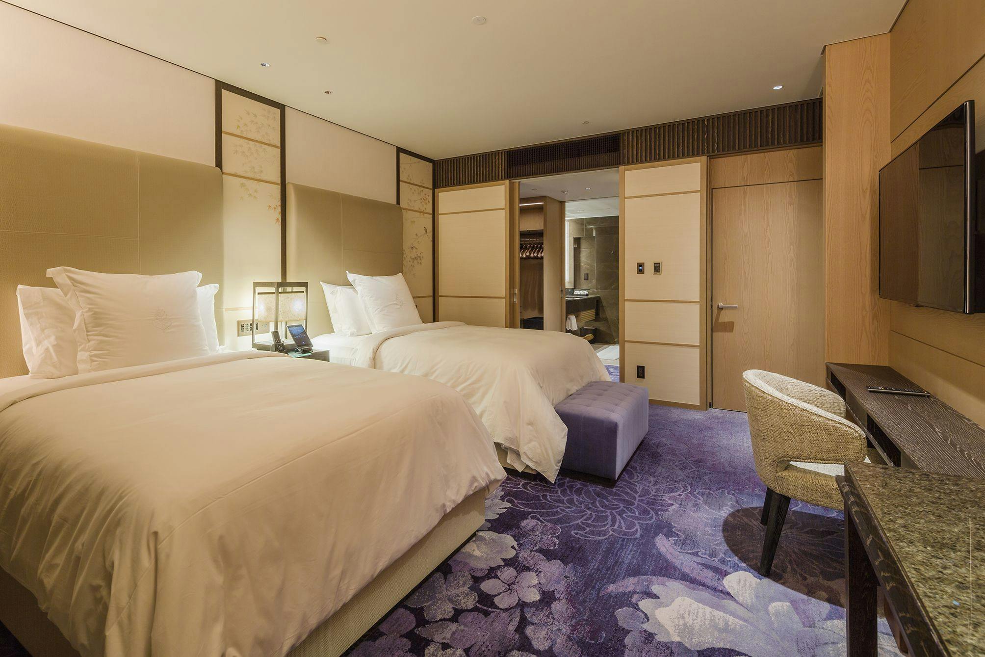 滞在する度に異なる季節の魅力を満喫できる由緒正しき名庭・積翠園を臨む52-53平米の客室。天井から床までの全面窓から堪能する庭園の美しさは格別。大理石のワーキングデスク、天然素材や京都の伝統色を随所に取り入れた上質で温もりあふれる滞在空間を演出しました。