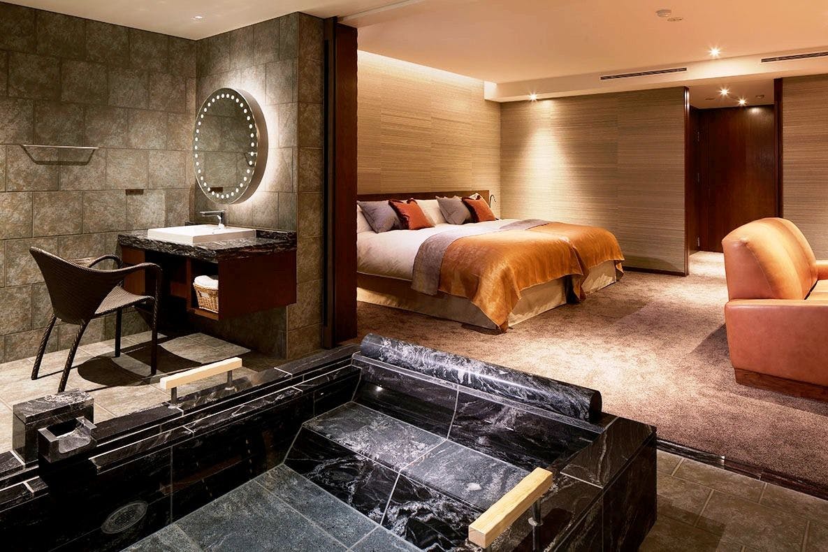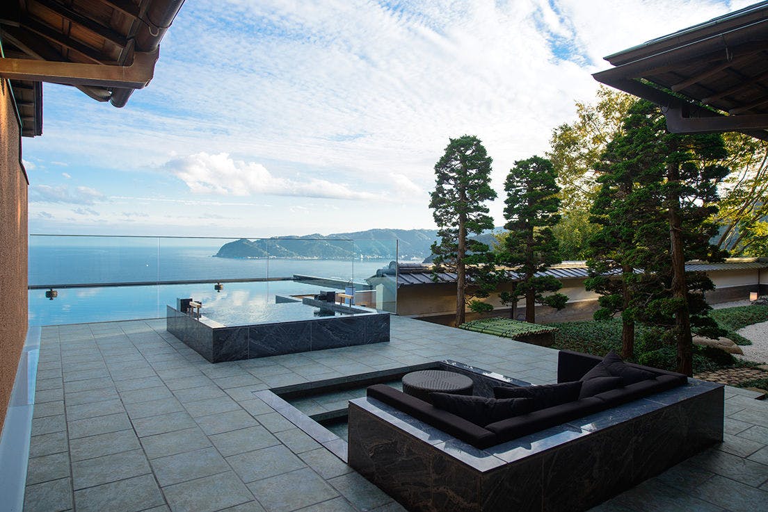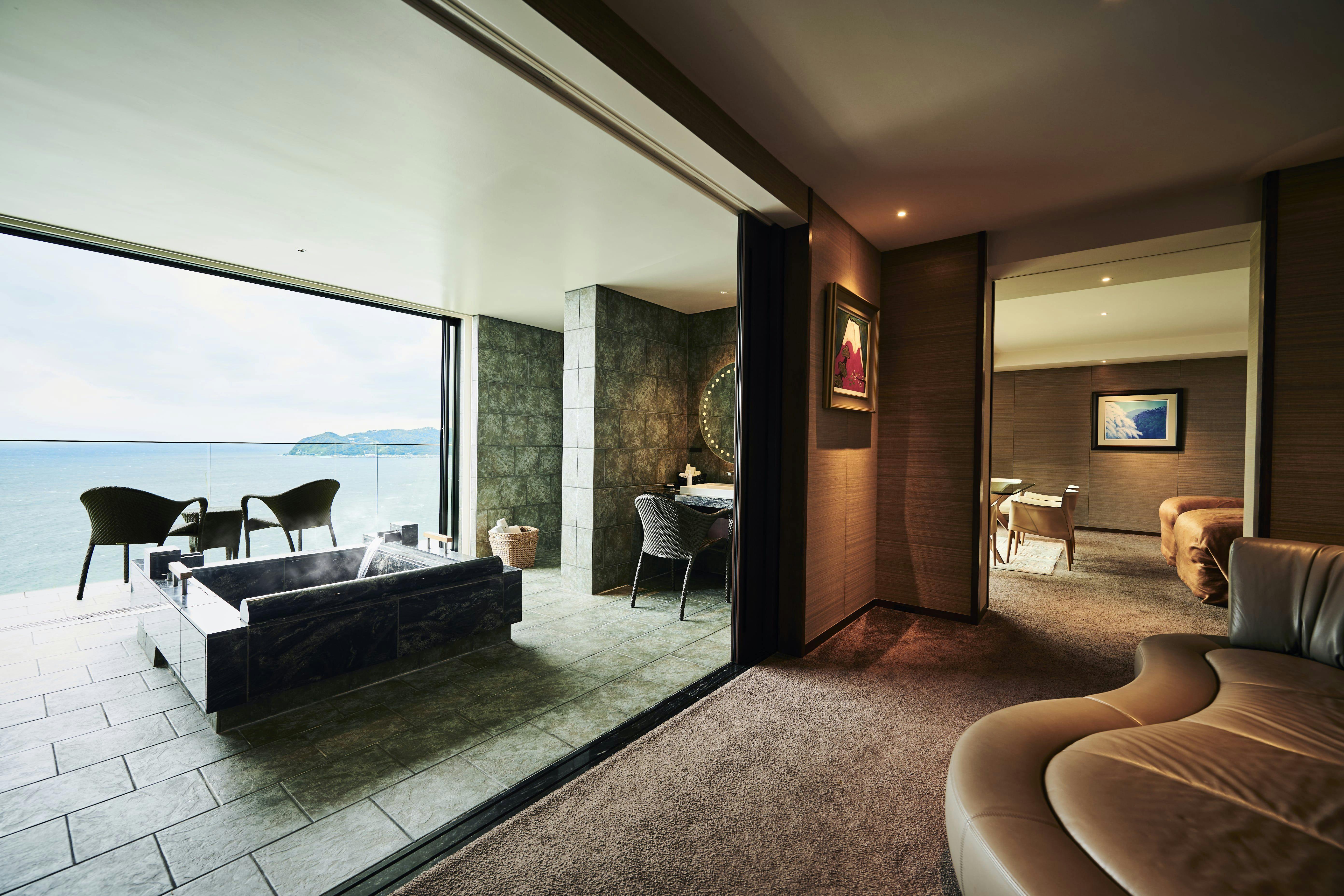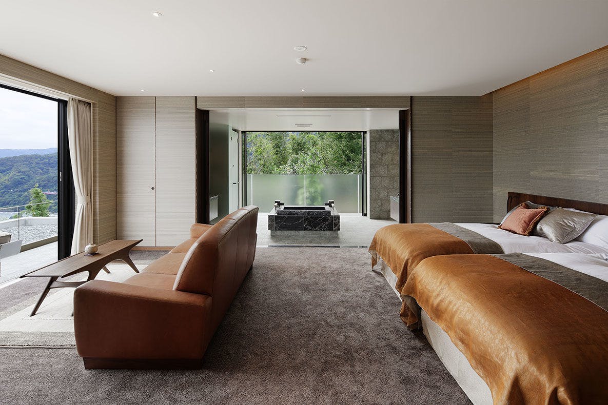客室内にも寛げるソファスペースを設けており、テラスをはじめどの場所からも相模湾を一望する空と海のパノラマが広がります。客室そのものの中に設えられた温泉風呂があり、お好きな時にいつでも熱海の名湯をお楽しみいただけます。
