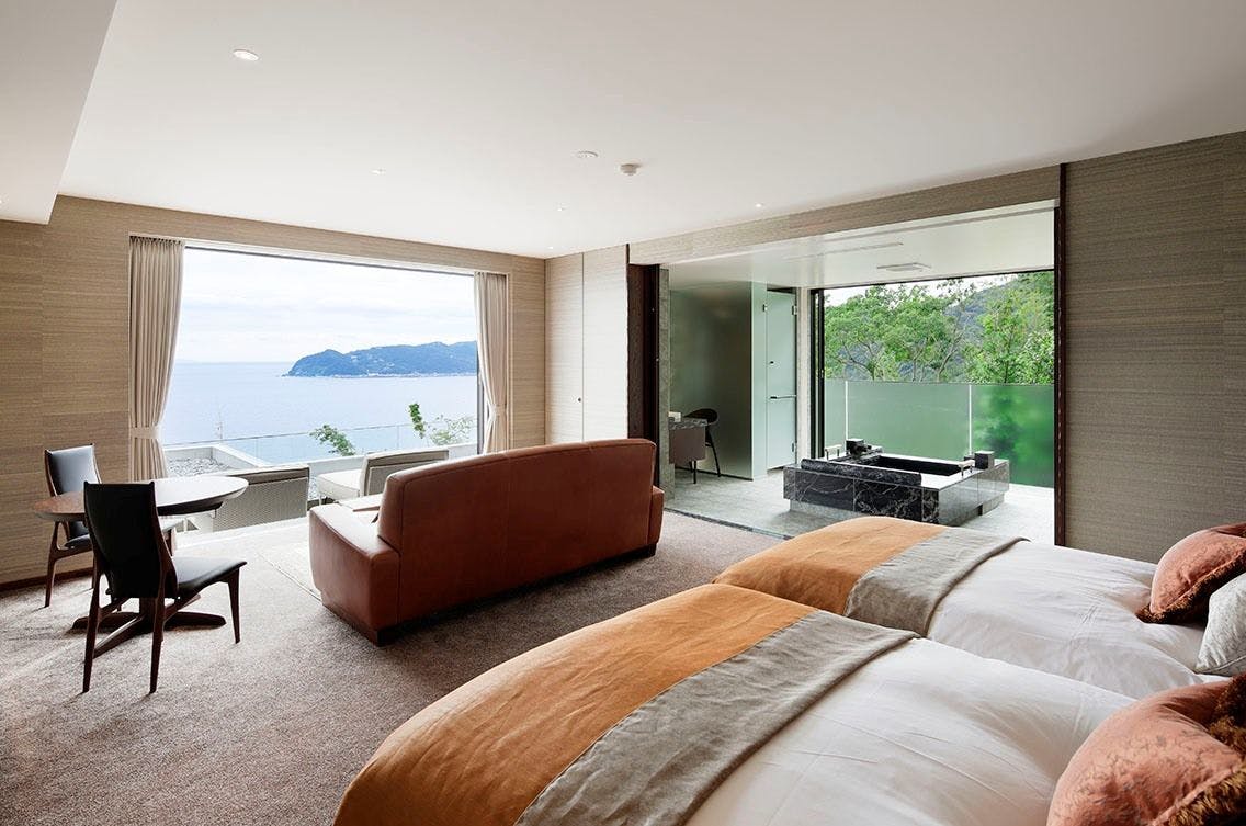 部屋に入るとベッドルームのすぐ奥には室内温泉風呂、その先に広がるのは海と空の景色。客室そのものの中に設えられた温泉風呂に入りながら見る相模湾の景色は格別です。寛げるテラスも付いており、開放感あふれる明るいお部屋です。