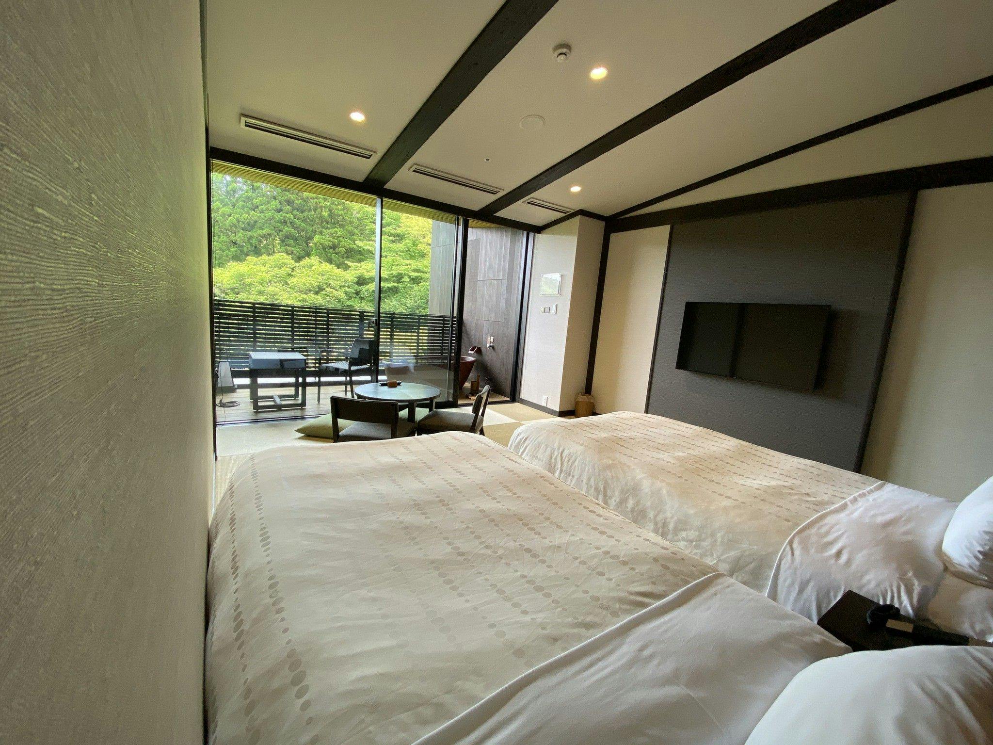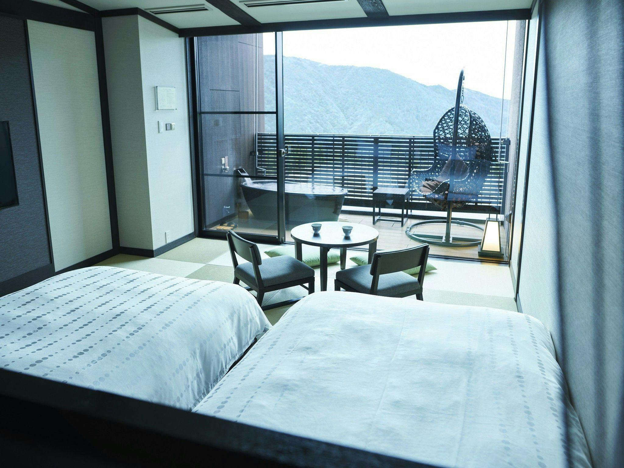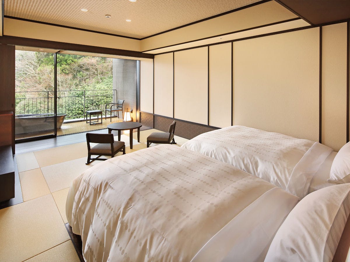 外輪山側の客室からは、明星ヶ岳や塔の峰など、箱根を取り囲む外輪山を遠くに望むことができ、渓谷側の客室からは、間近に迫る木々の葉のきらめきと渓谷のせせらぎの音による、自然との一体感を感じることができます。