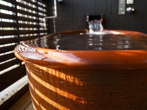 ご夕食は17:00~17:30の間にご案内いたします。温泉露天風呂付客室(外輪山側/渓谷側)すべての客室に、信楽焼きの特注露天風呂を備えています。