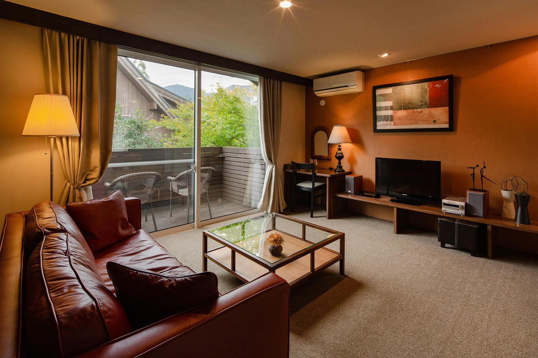 本館2階に位置する、ウッドテラスも併設した約45平米の和モダンスタイルのスーペリアルーム(2室)
